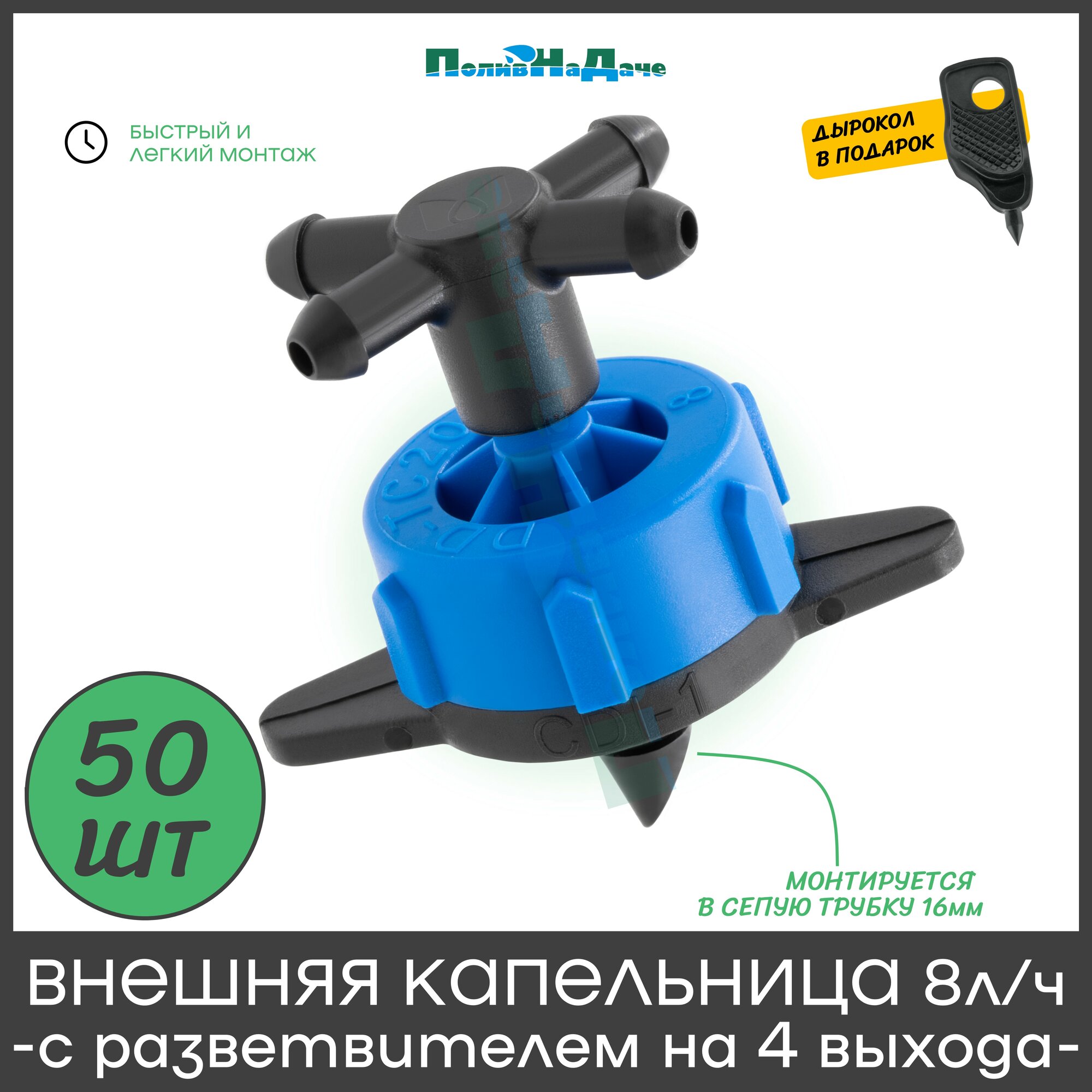 Купить Внешняя капельница компенсированная 8 л/ч (разборная) с разветвителем на 4 выхода. Упаковка 50 шт + дырокол.