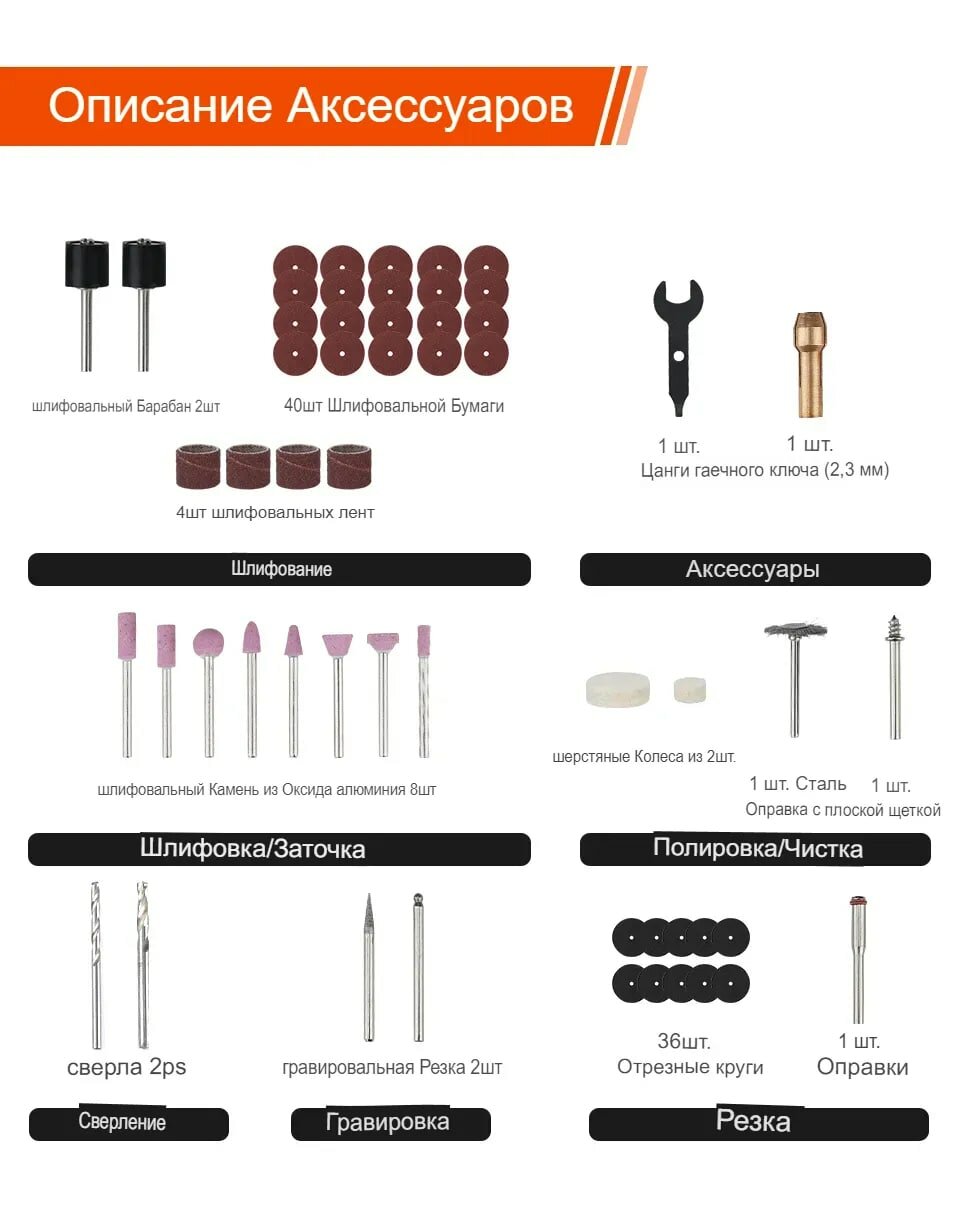 | Комплектация | гравер-1шт., аккумулятор-1шт., зарядное устройство-1шт., набор насадок-105шт., сумка для хранения и переноски-1шт., инструкция |