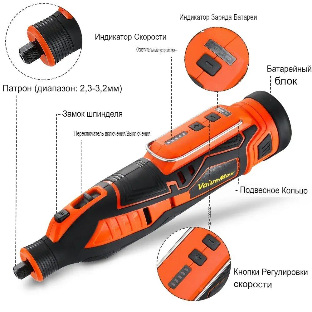 Гравер аккумуляторный ValueMax для полировки, шлифовки, гравировки , 12V, 5 скоростей + набор из 105 насадок интересное: