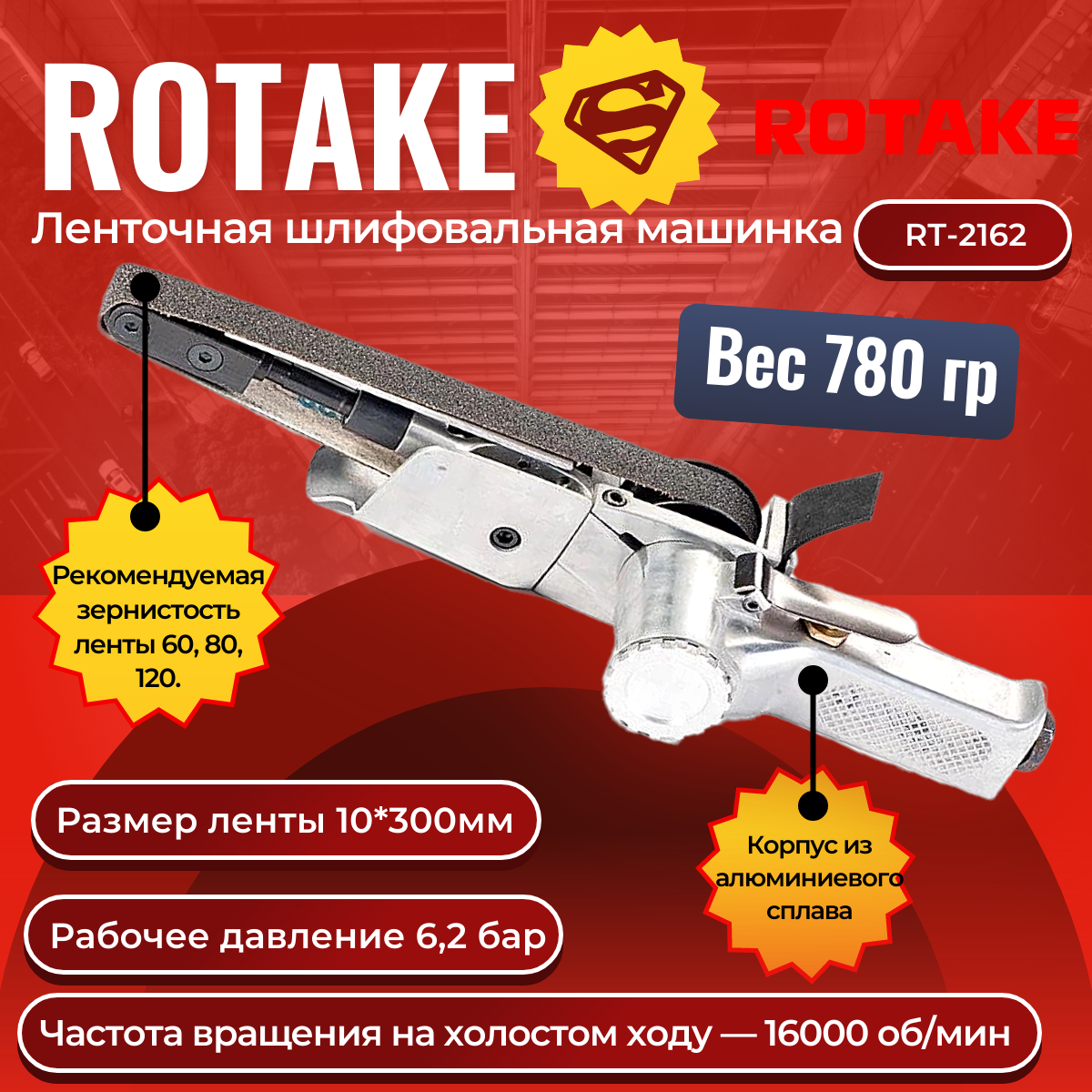 | Комплектация | Rotake RT-2162 Ленточная шлифовальная машинка; 1600 об/мин, 10*300 мм, 0.78 кг |