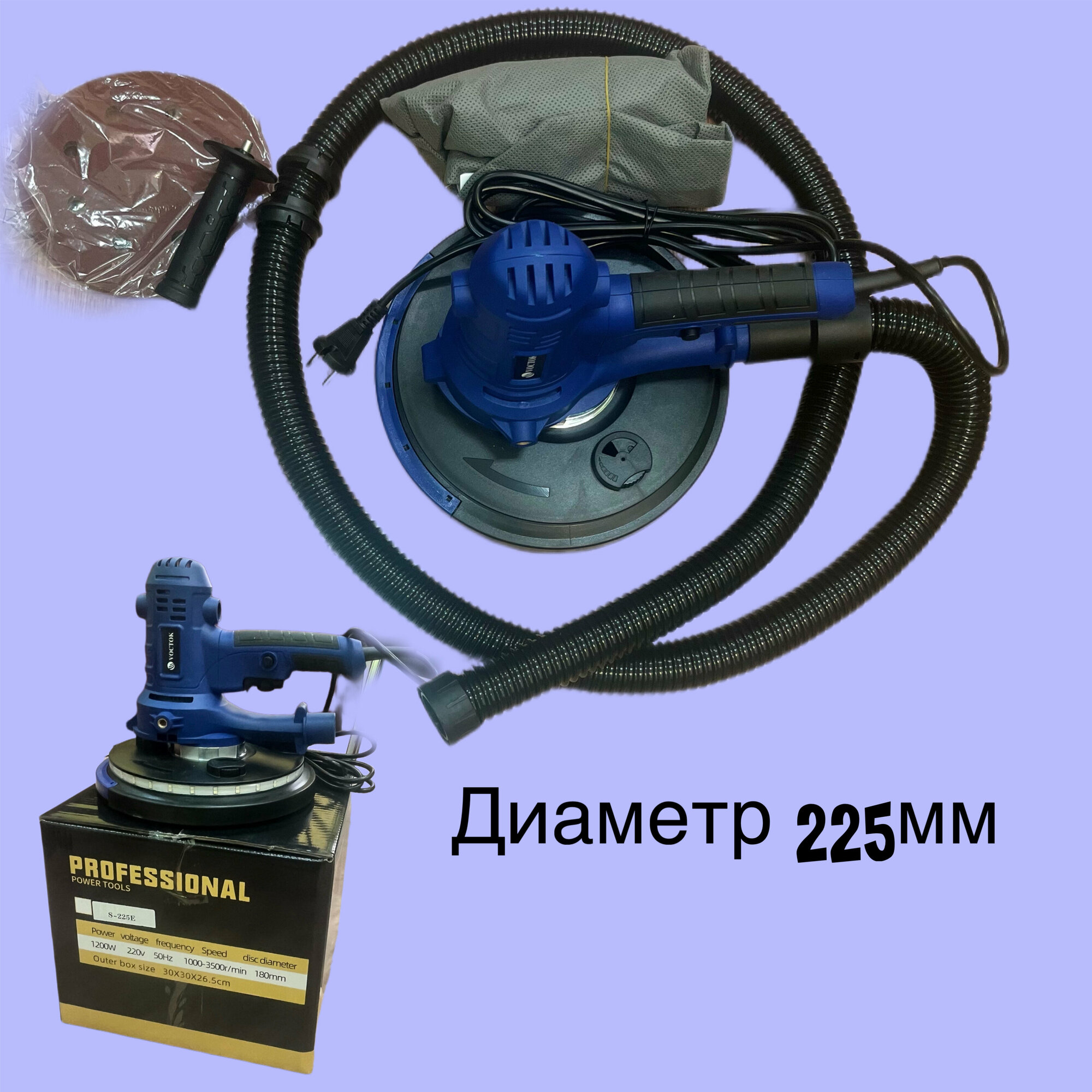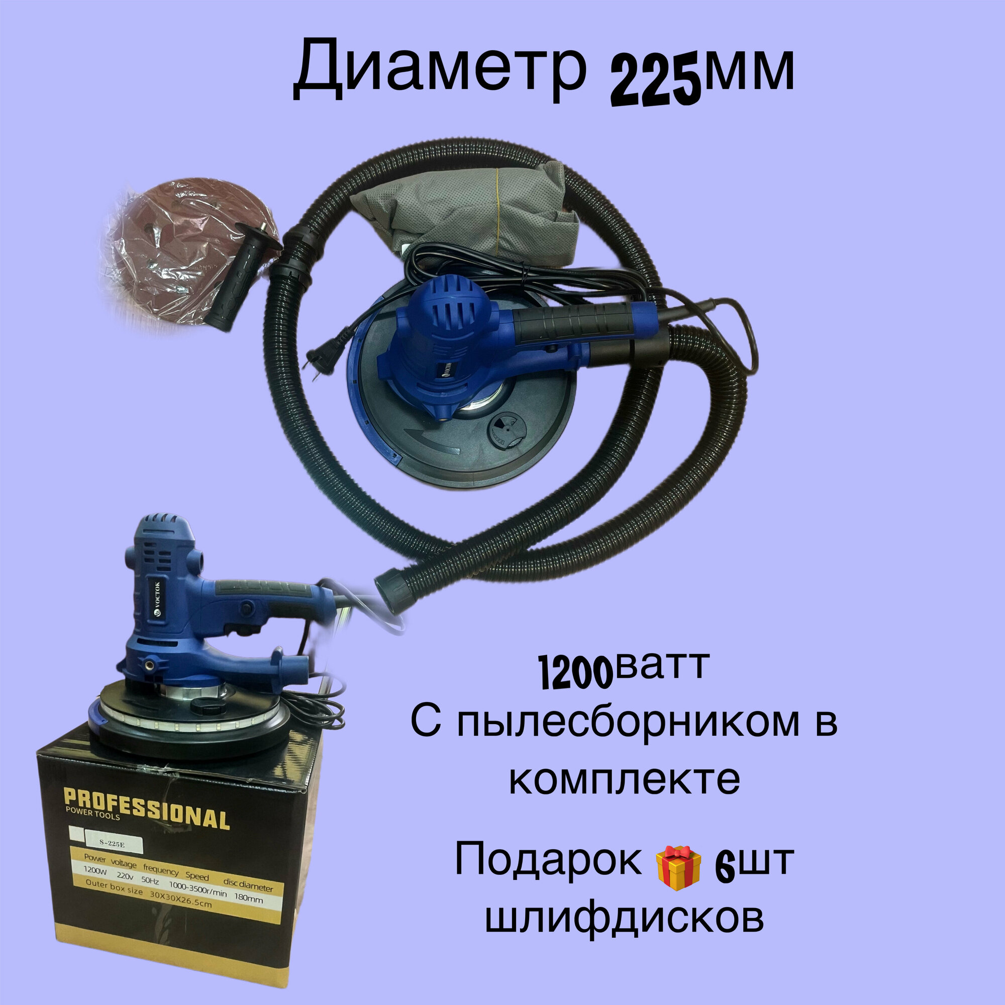| Комплектация | Шлифовальный аппарат-1шт, шланг-1шт, пылесборник-1шт, круг шлифовальный-6шт, шестигранник/ручка-1шт, коробка-1шт |