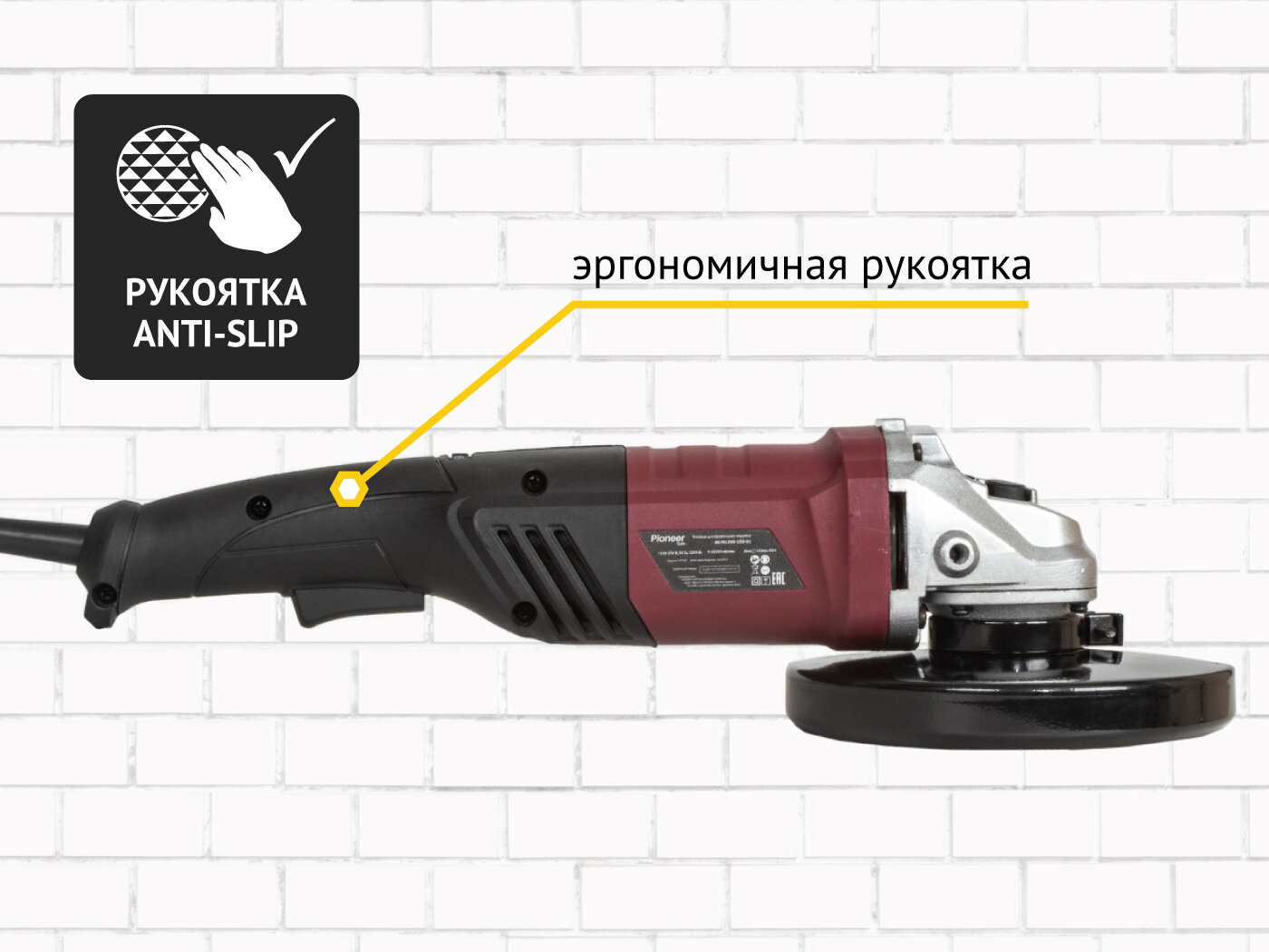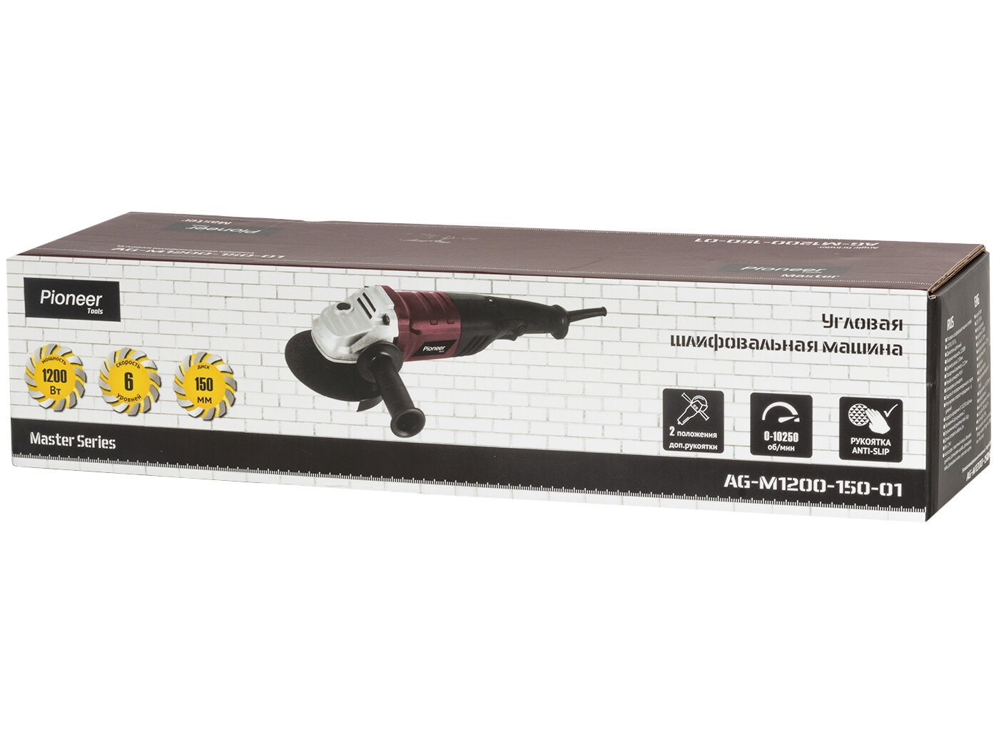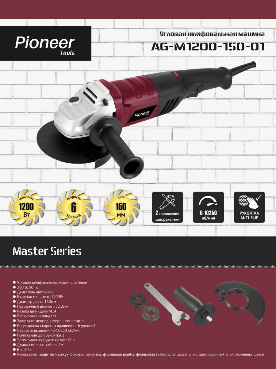 Купить Угловая шлифмашина болгарка Pioneer AG-M1200-150-01 сетевая с щеточным двигателем, 6 уровней скорости, блокировка шпинделя, 2 положения рукоятки Anti-Slip, 1200 Вт