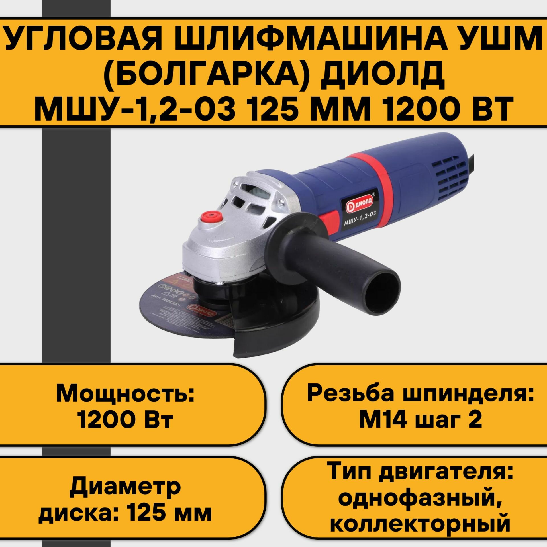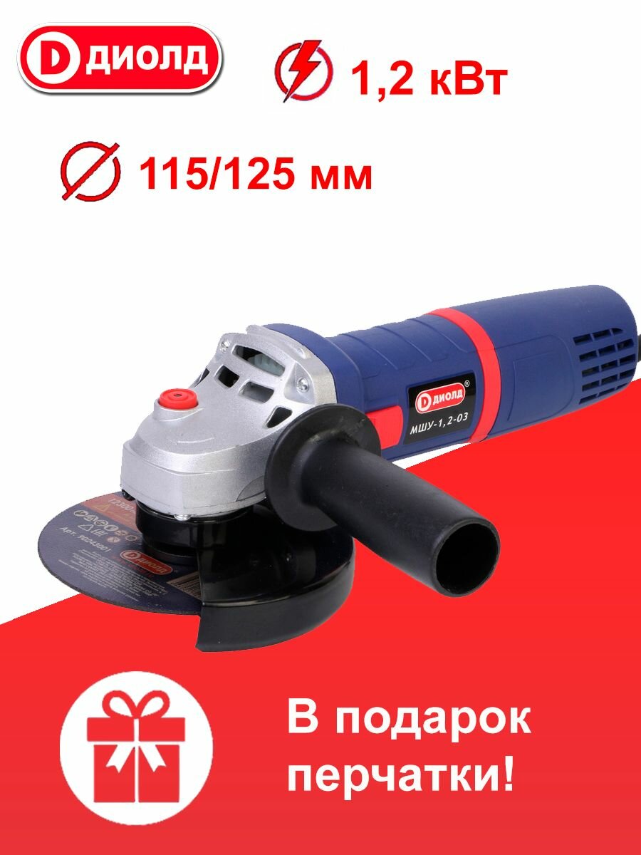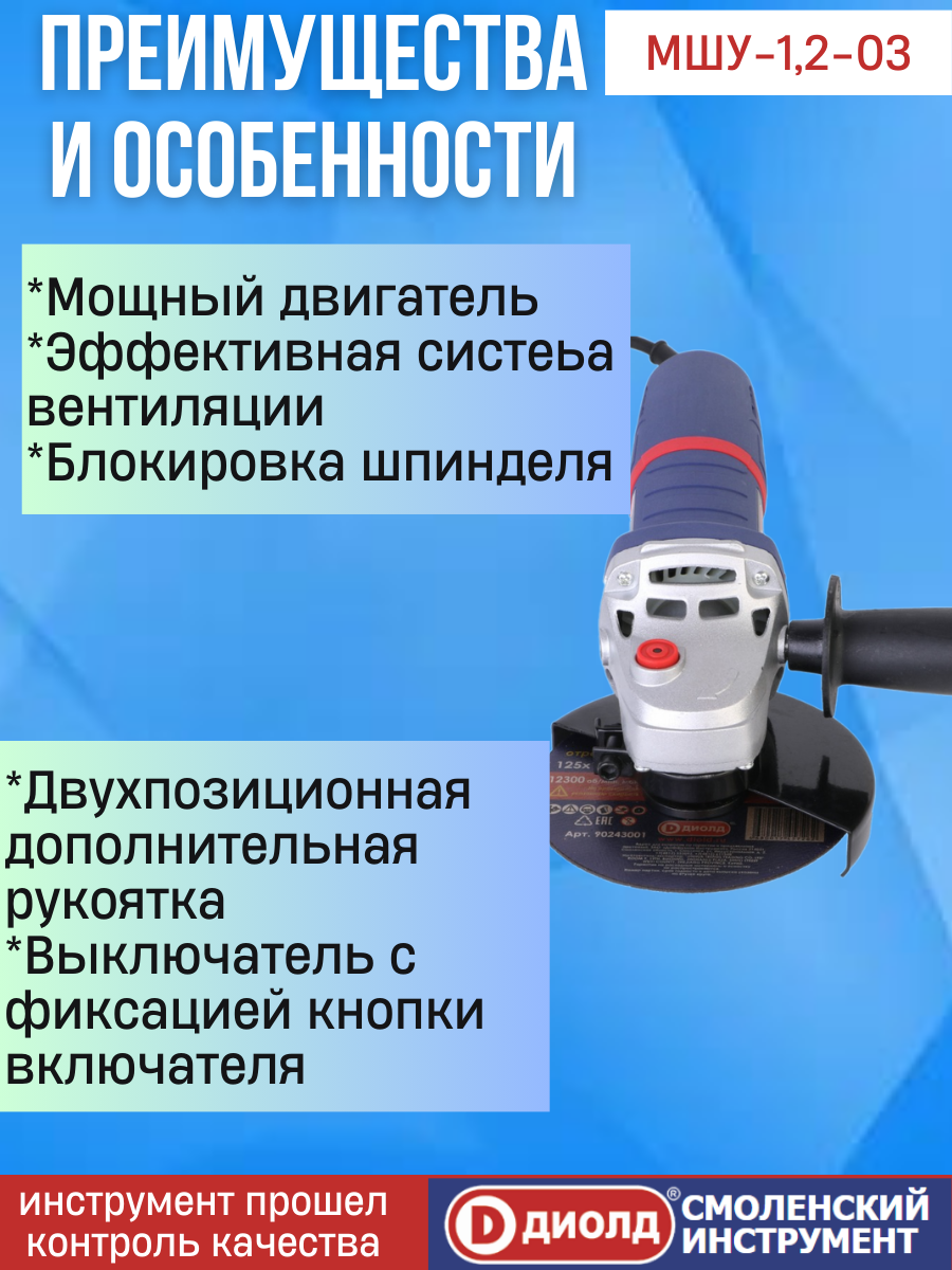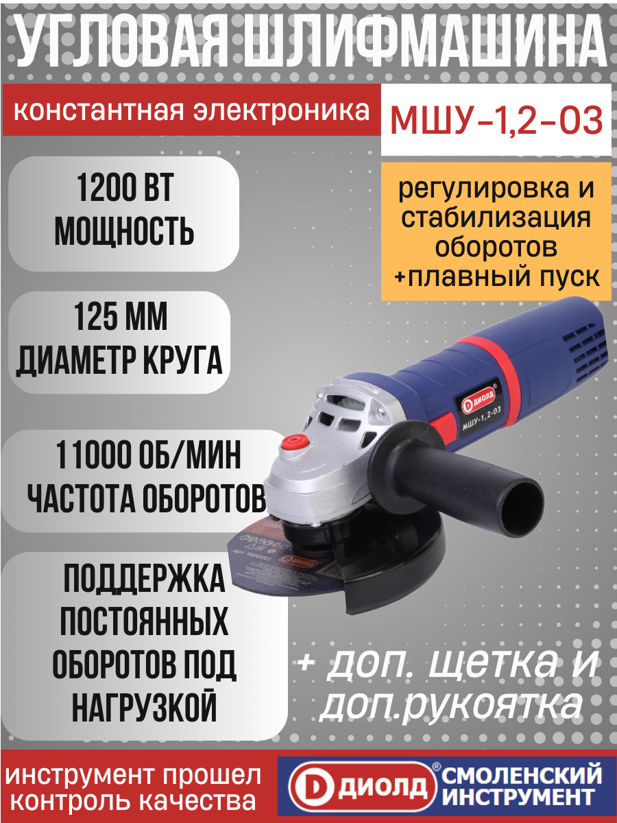 Купить Болгарка Диолд МШУ-1,2-03 1200 Вт (УШМ, шлифмашина), 125 мм, 3000-11000 об/мин, константная электроника, плавный пуск, регулировка оборотов производитель Россия