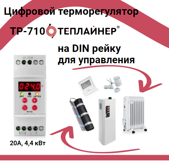 Терморегулятор на DIN рейку для котла, теплых полов Теплайнер ТР-710 (NC, NO, сухой контакт, 20А, 4.4 кВт, -20 ... +100)