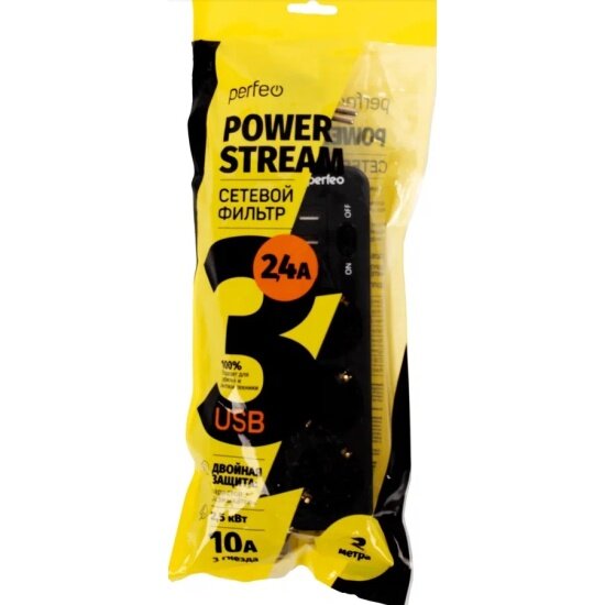 Купить Сетевой фильтр Perfeo "POWER STREAM", 2500W, двойная защита, 2м, 3 розетки, 3 USB, черный (PF_C3907)