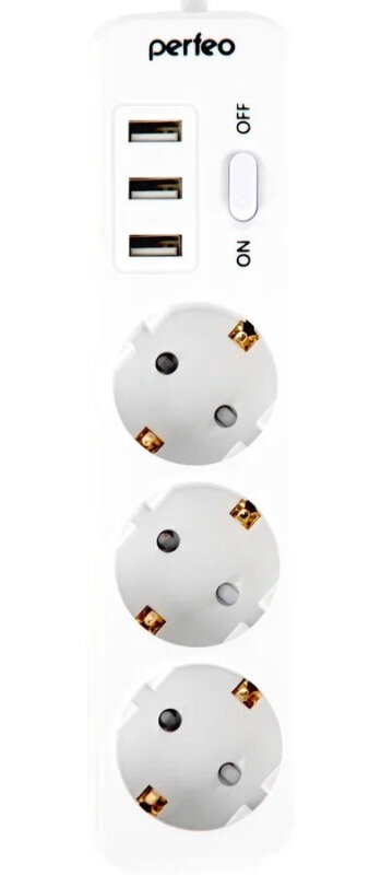 Сетевой фильтр Perfeo "POWER STREAM", 2500W, двойная защита, 2м, 3 розетки, 3 USB, белый (PF_C3906)