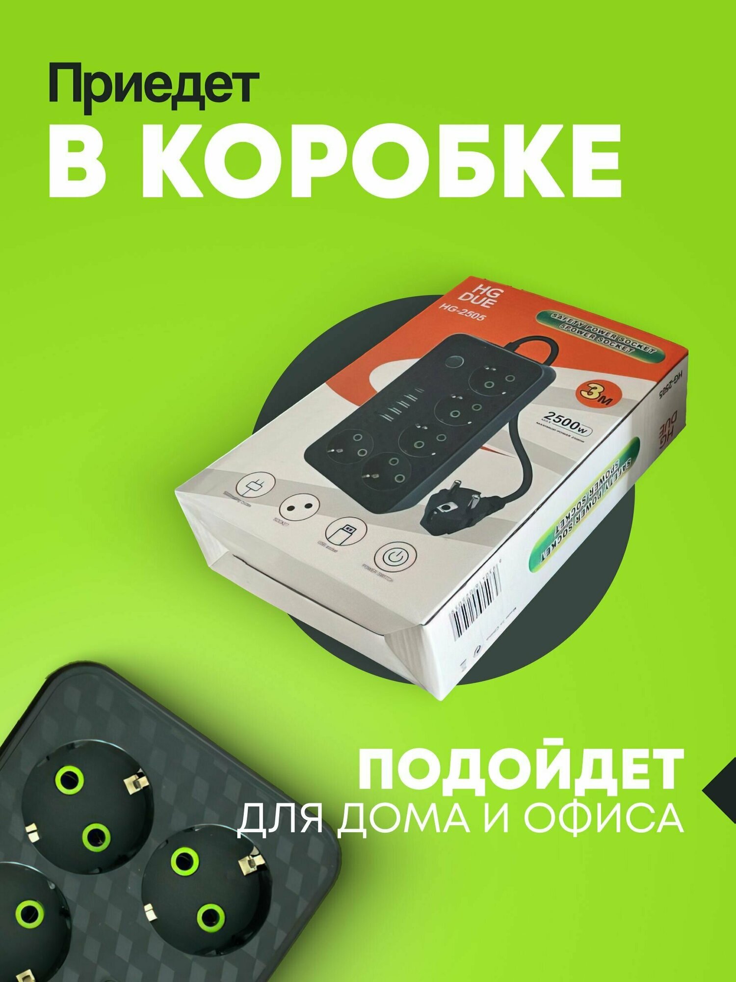 Сетевой удлинитель черный с выключателем 3 розетки, 4 USB входа, 1 Type-C, 3 метра/ Тройник.