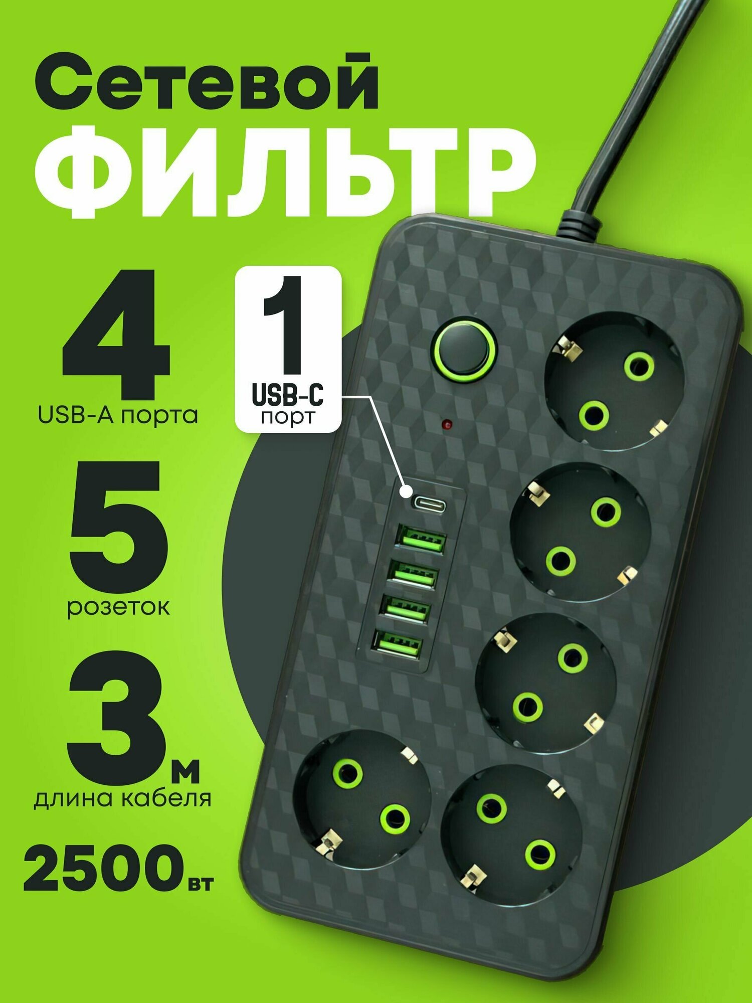 Удлинитель / Сетевой фильтр с USB и type-C, 5 розеток 4 USB +1 Type-C / Пилот интересное:
