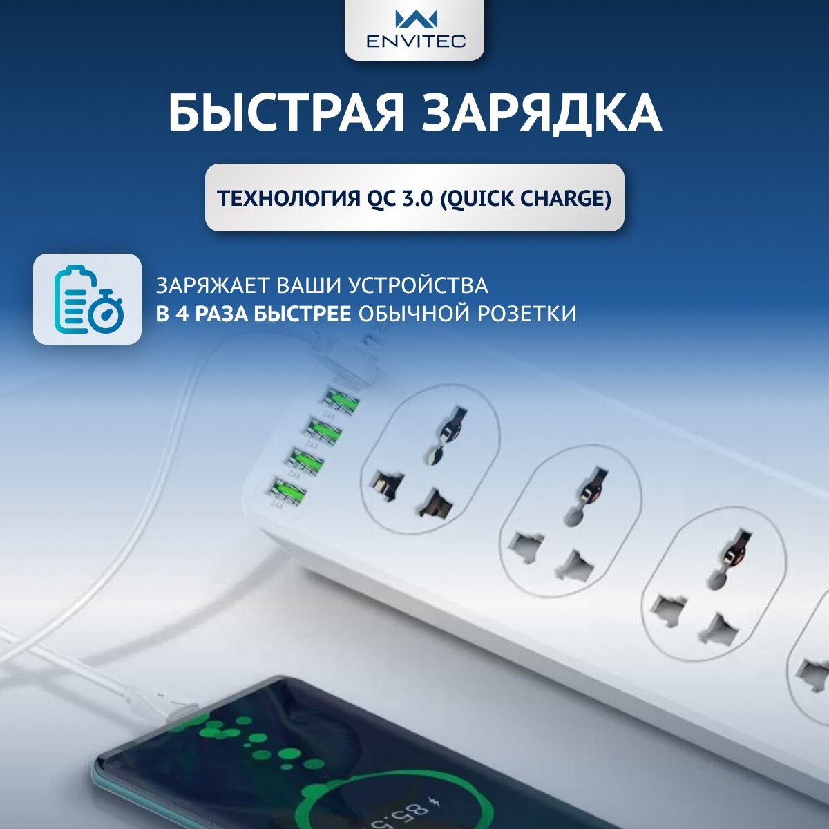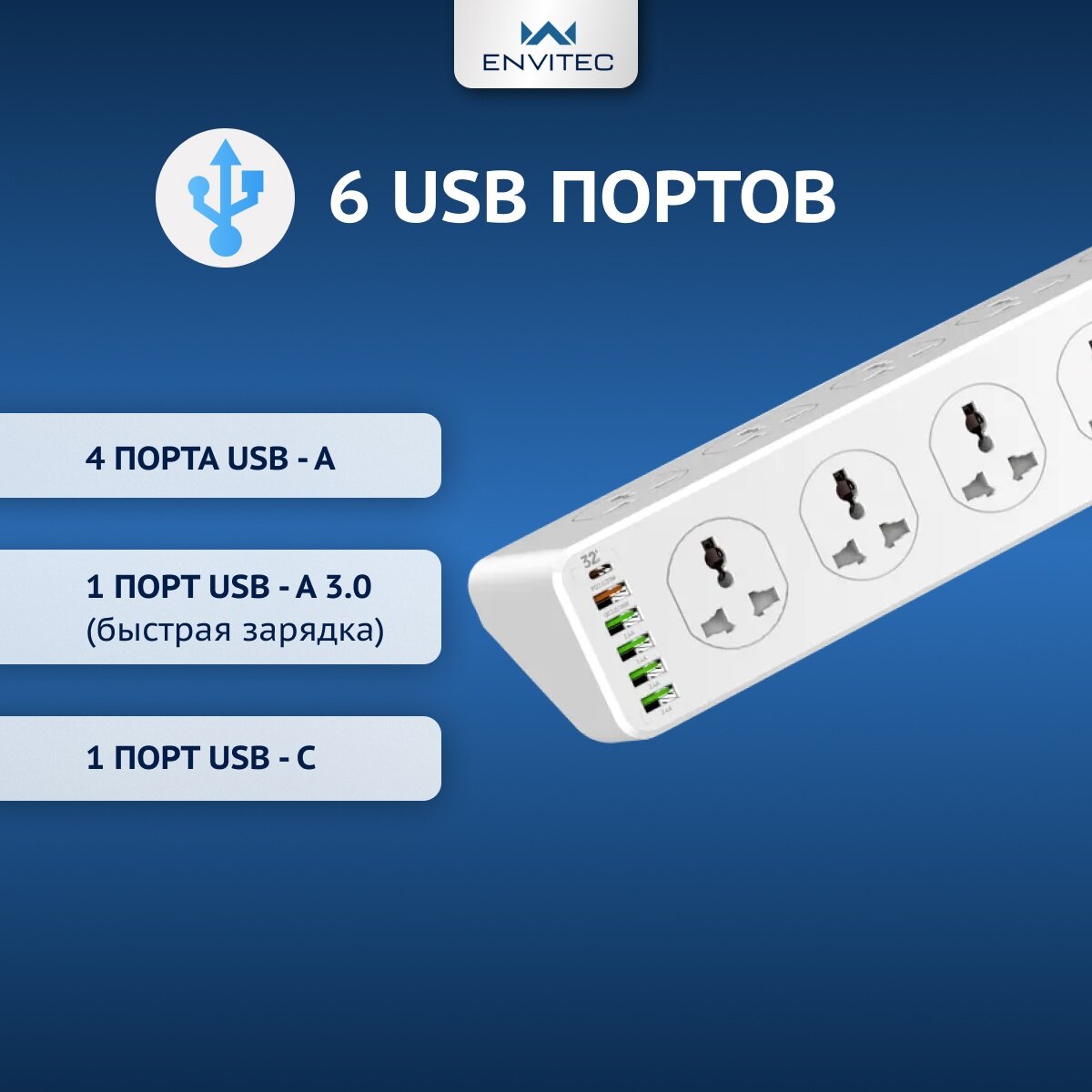 Сетевой фильтр удлинитель Envitec с USB портами (10 розеток + 5 USB A + 1 USB Type C) интересное: