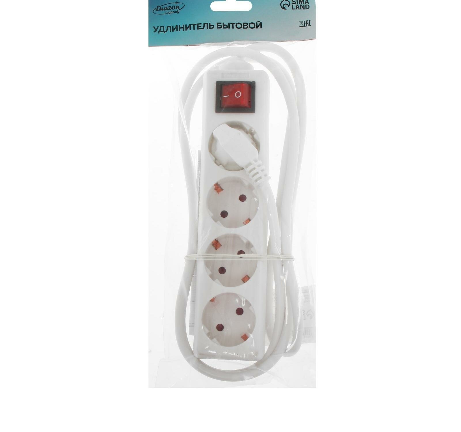 Luazon Lighting Удлинитель 3 розетки, 3 м, 10 А, 2200 Вт, ПВС 3х0.75 мм2, с з/к, белый