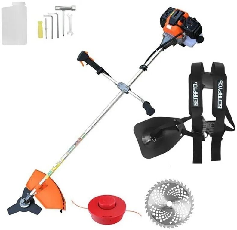 | Подробная комплектация | В комплект входят диск круглый с напайками и полуавтоматическая шпуля в сборе, а так же удобный ранцевый ремень на два плеча с защитой бедра для комфортной длительной работы, набор ключей для сборки триммера, инструкция |