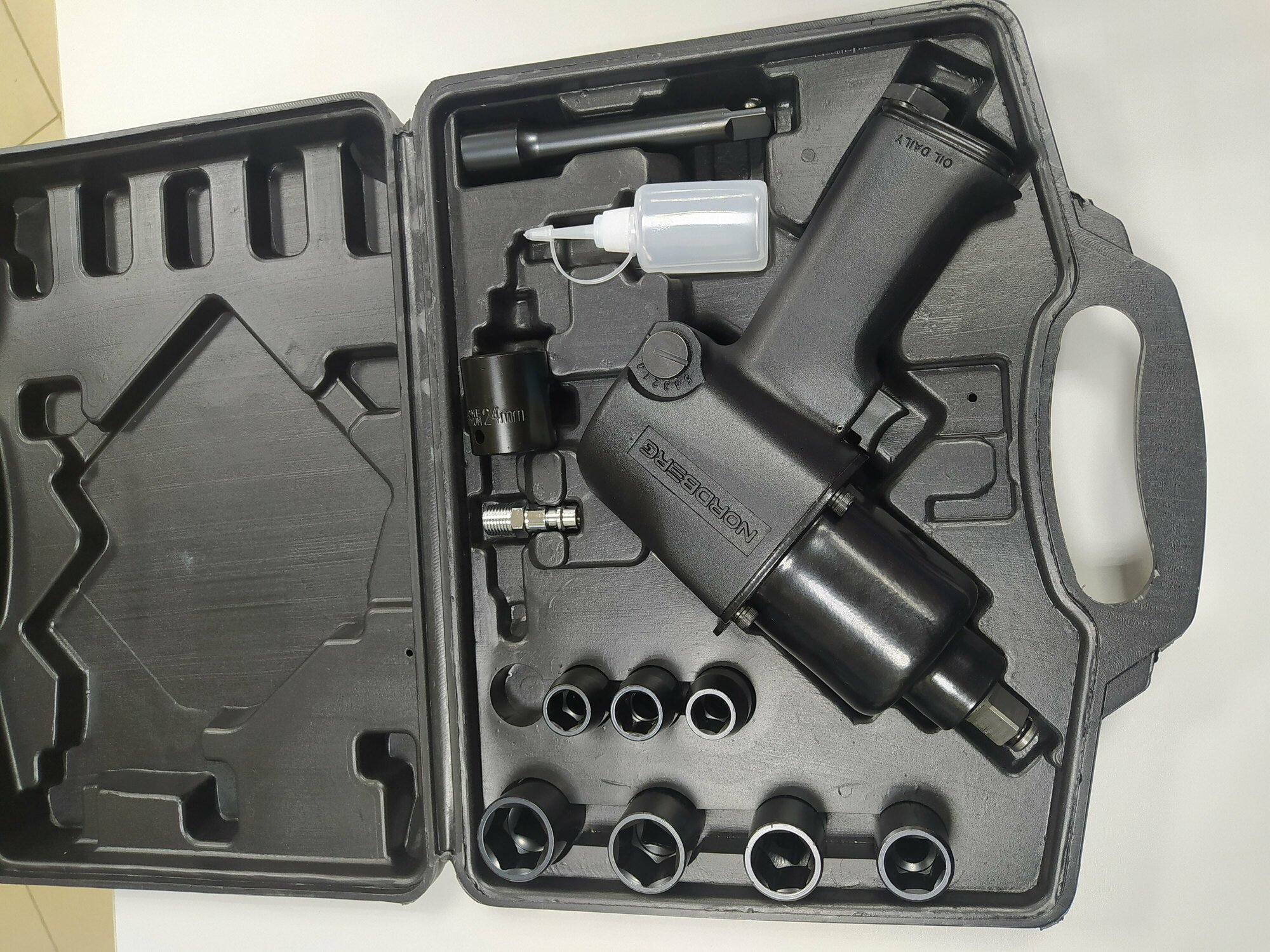 | Комплектация | Ударный пневмогайковерт; Головки: 10, 11, 13, 14, 17, 19, 22, 24; Штуцер; Удлинитель для торцевых головок; Масленка; Кейс. |