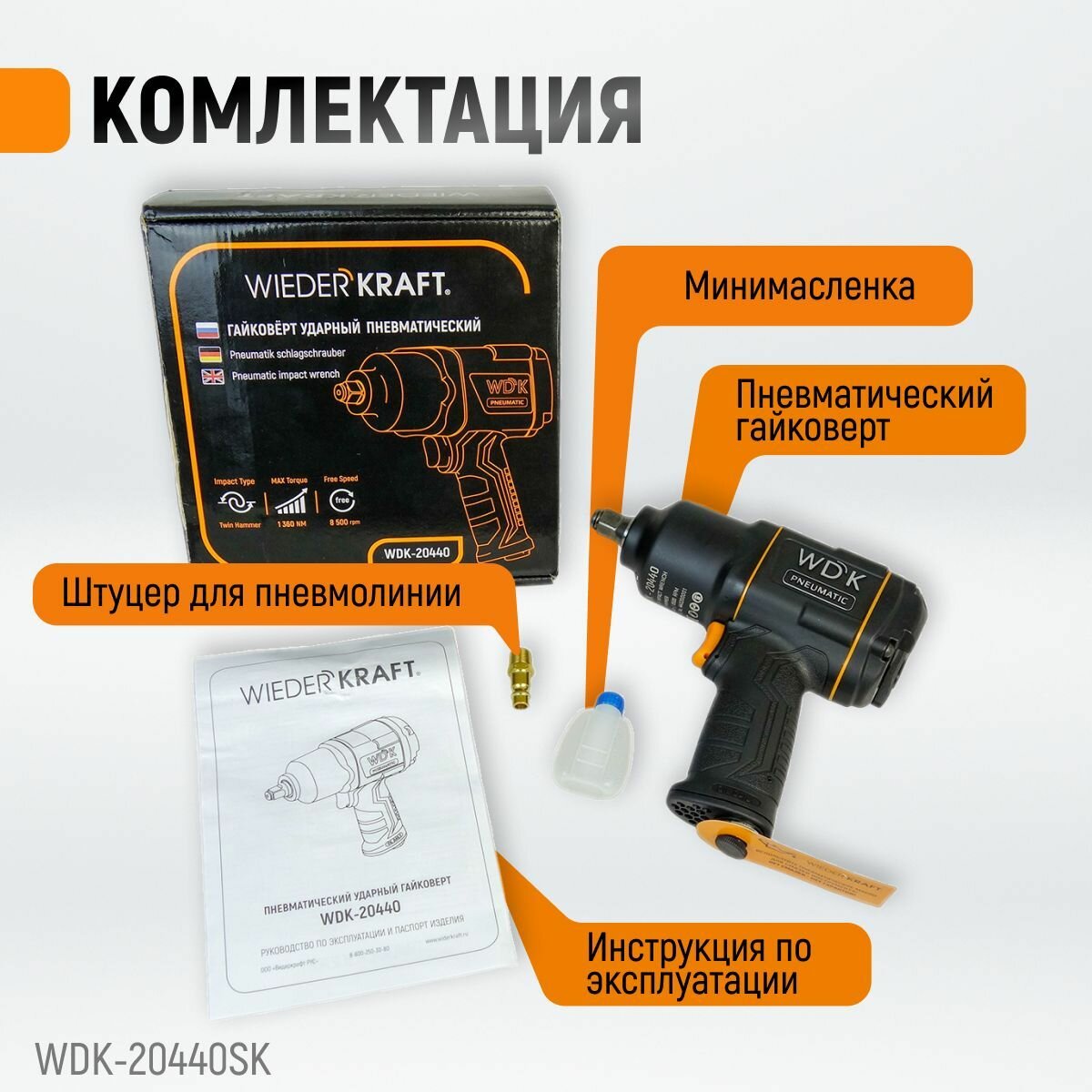 | Комплектация | Гайковерт пневматический ударный WIEDERKRAFT 1/2", 1360 Нм WDK-20440 с набором ударных головок WDK-710 |