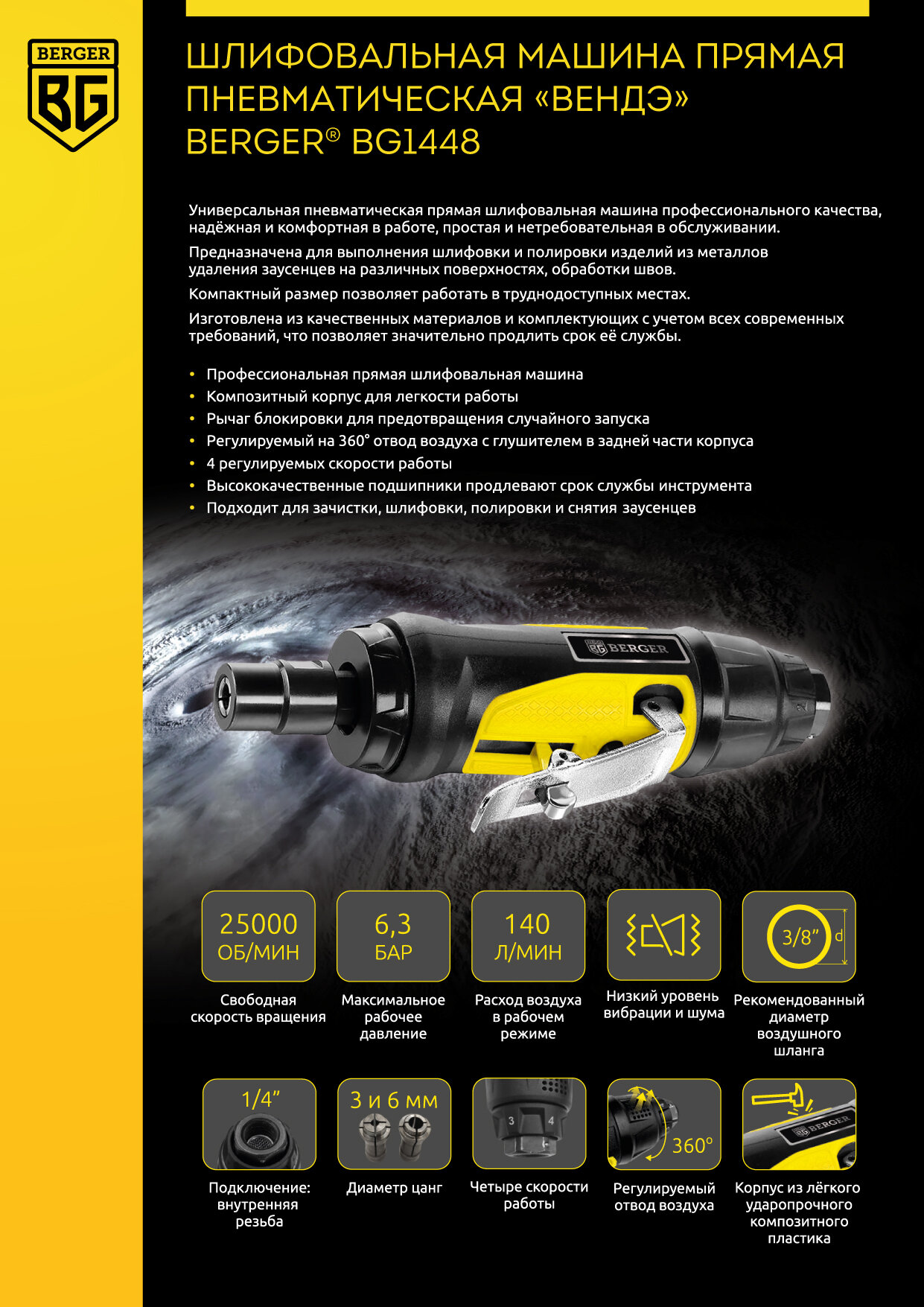 Шлифовальная машина прямая пневматическая 1/8" - 1/4" BERGER BG1448 интересное:
