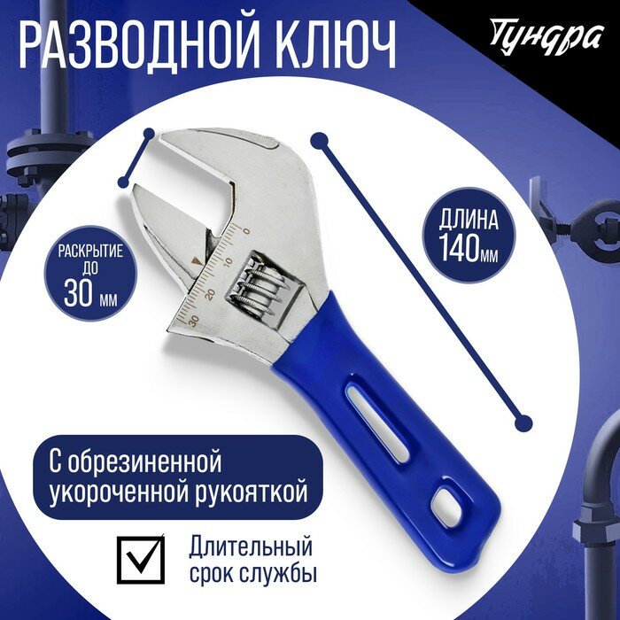 Купить Ключ разводной тундра, укороченная обрезиненная рукоятка, широкий захват до 30 мм, 140 мм