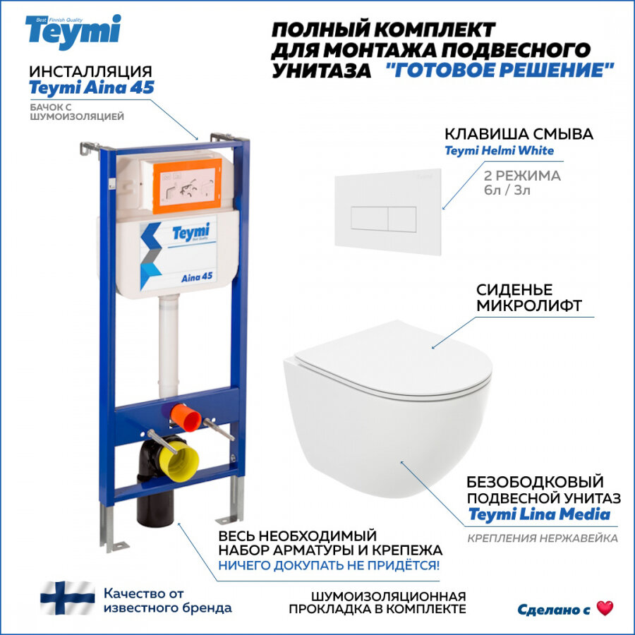 Комплект Teymi "Готовое решение": Инсталляция Aina 45 + клавиша смыва Helmi белая + унитаз Lina Media F01278 интересное: