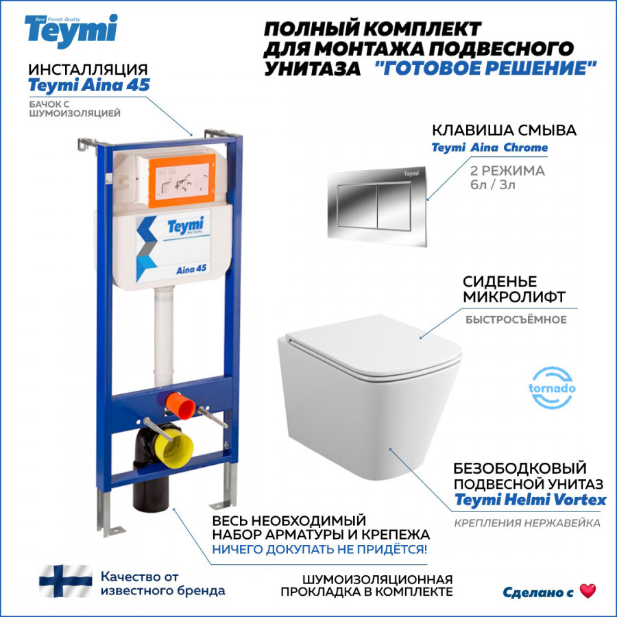 Готовое решение Teymi: Инсталляция Aina 45 + клавиша смыва Aina хром + унитаз Helmi Vortex F01229 интересное: