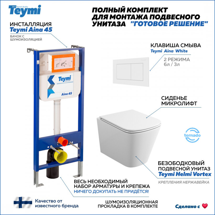 Комплект Teymi "Готовое решение": Инсталляция Aina 45 + клавиша смыва Aina белая + унитаз Helmi Vortex F01235 интересное: