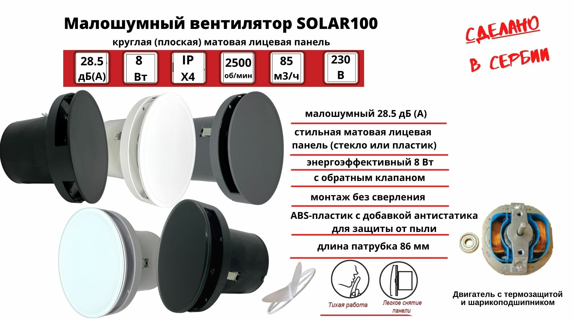 Круглый (стеклянная панель) вентилятор D100мм, малошумный (28,5дБ), VENTFAN Solar100, белый матовый, Сербия интересное: