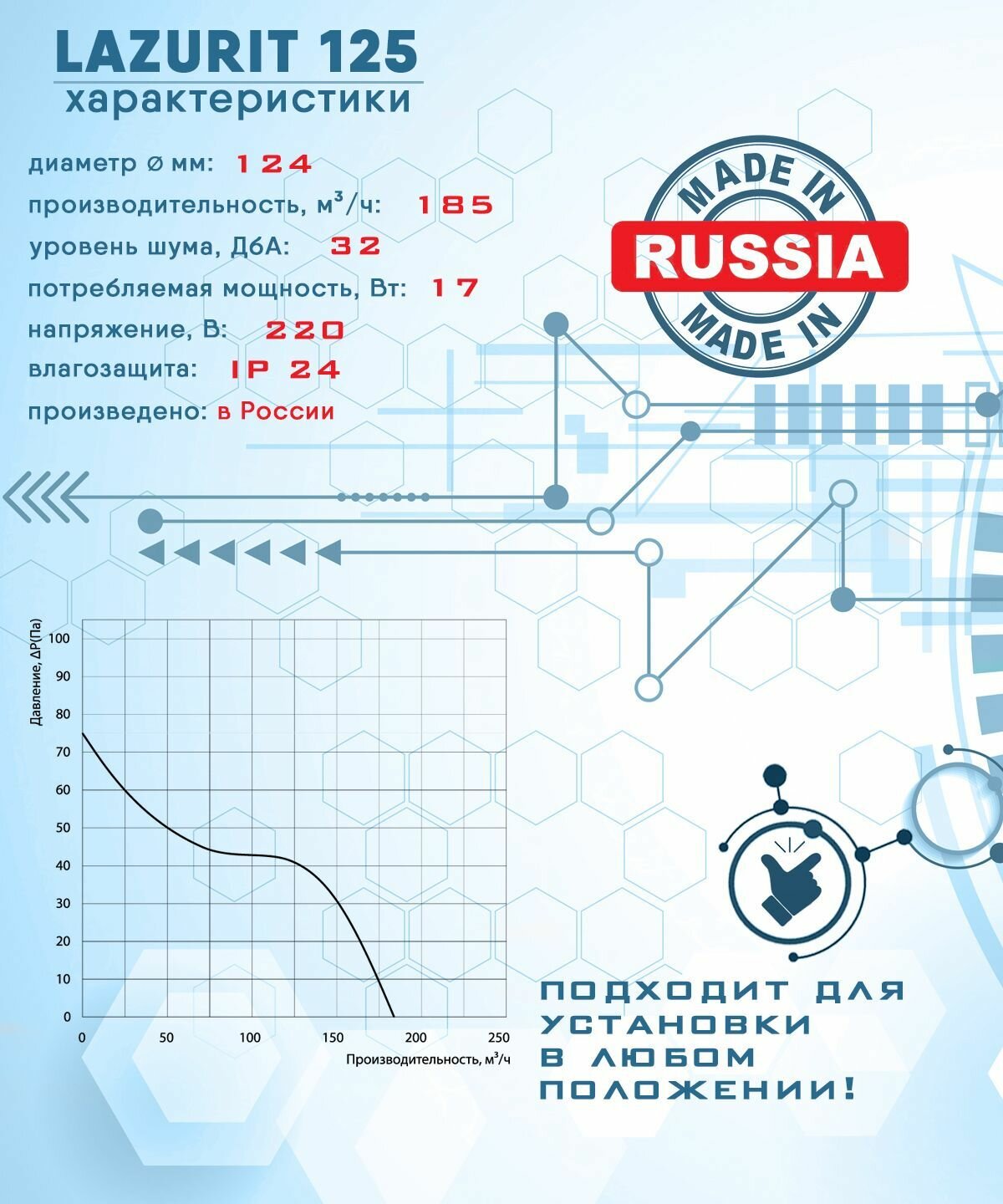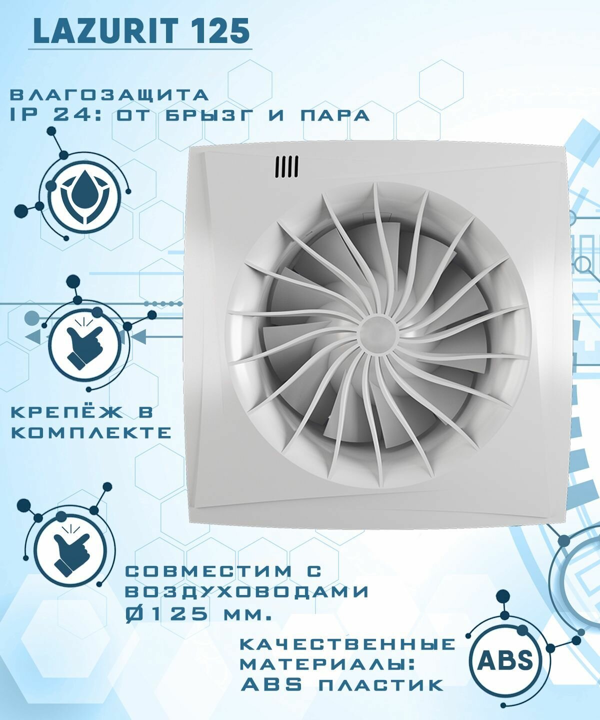 Lazurit 125 вентилятор вытяжной малошумный 32 Дб энергоэффективный 17 Вт на шарикоподшипниках с обратным клапаном диаметр 125 мм ZERNBERG интересное: