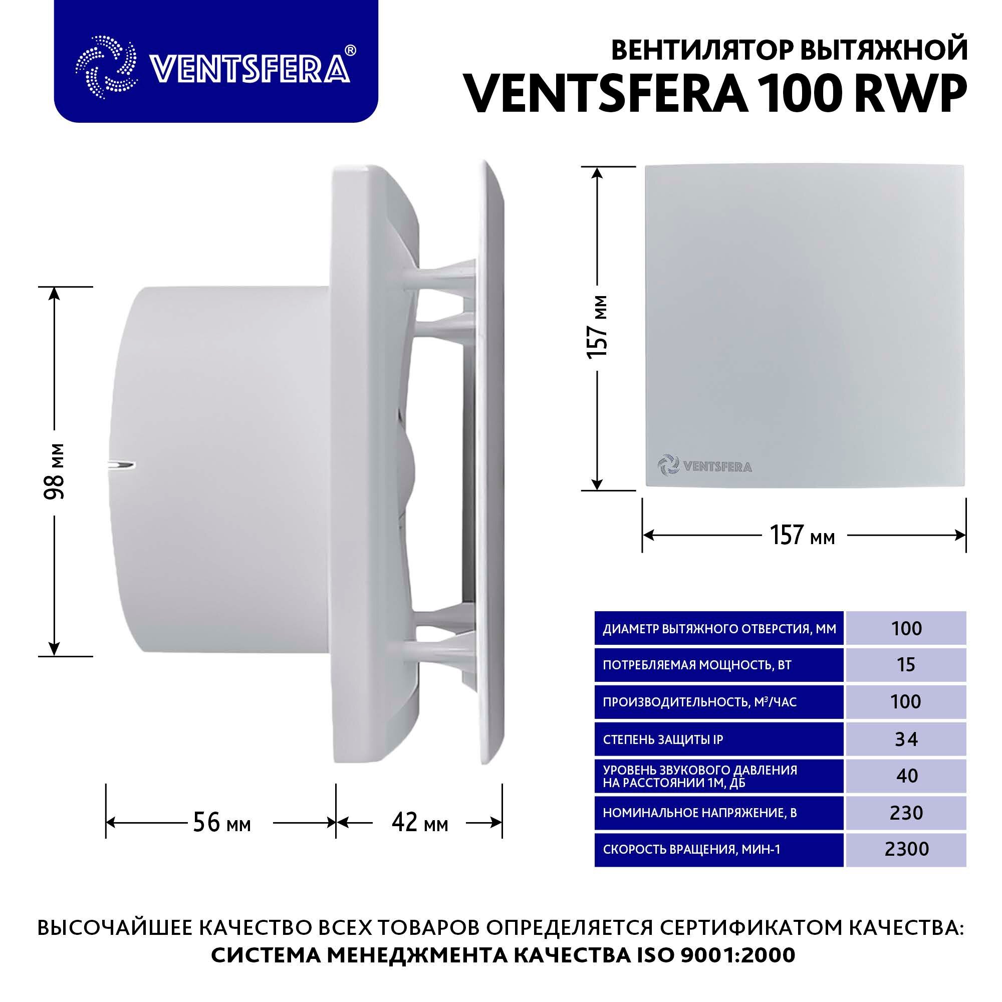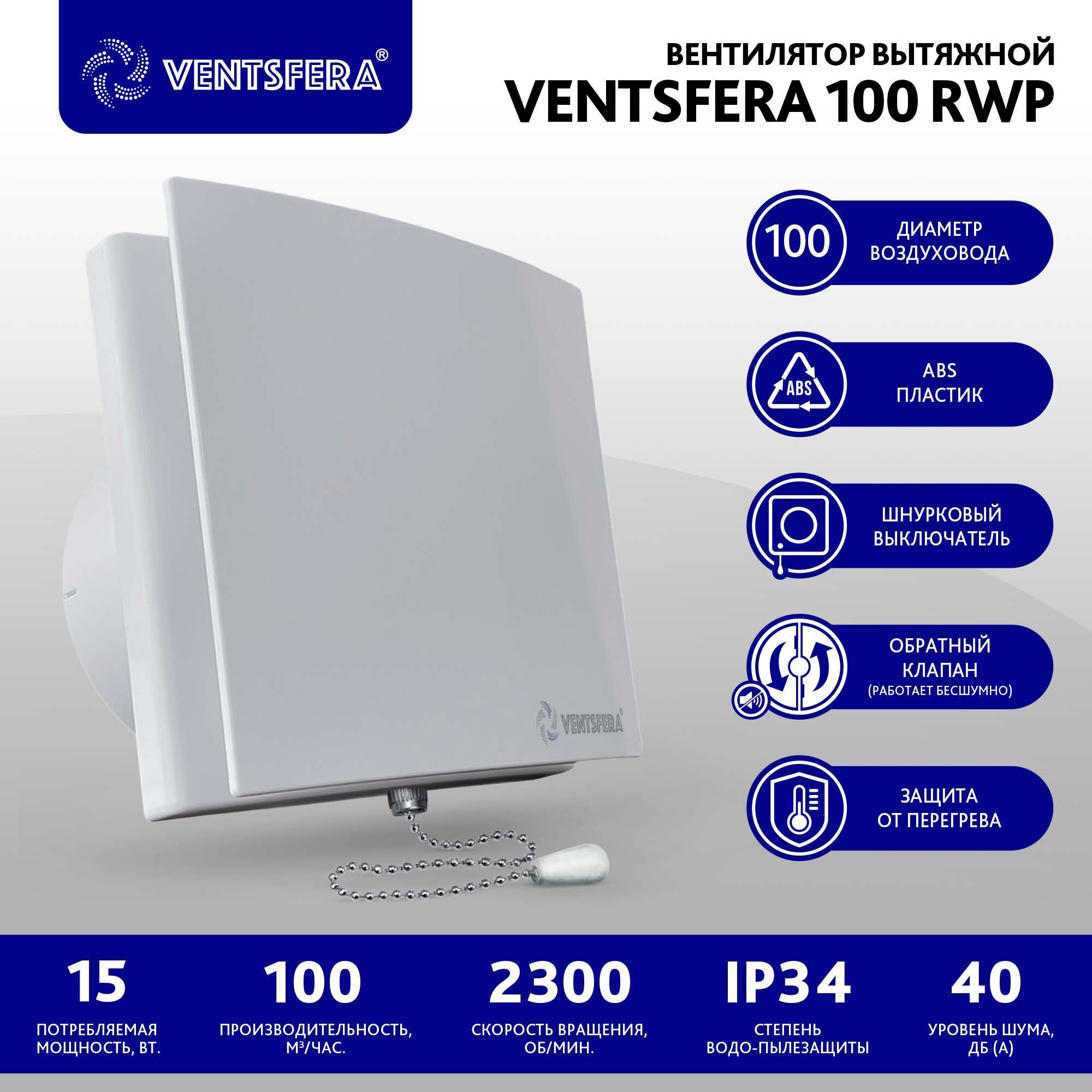 Вентилятор вытяжной D100 mm. С лицевой панелью, шнурковым выключателем и обратным клапаном, VENTSFERA 100 RWp, пластиковый, для кухни, туалета интересное: