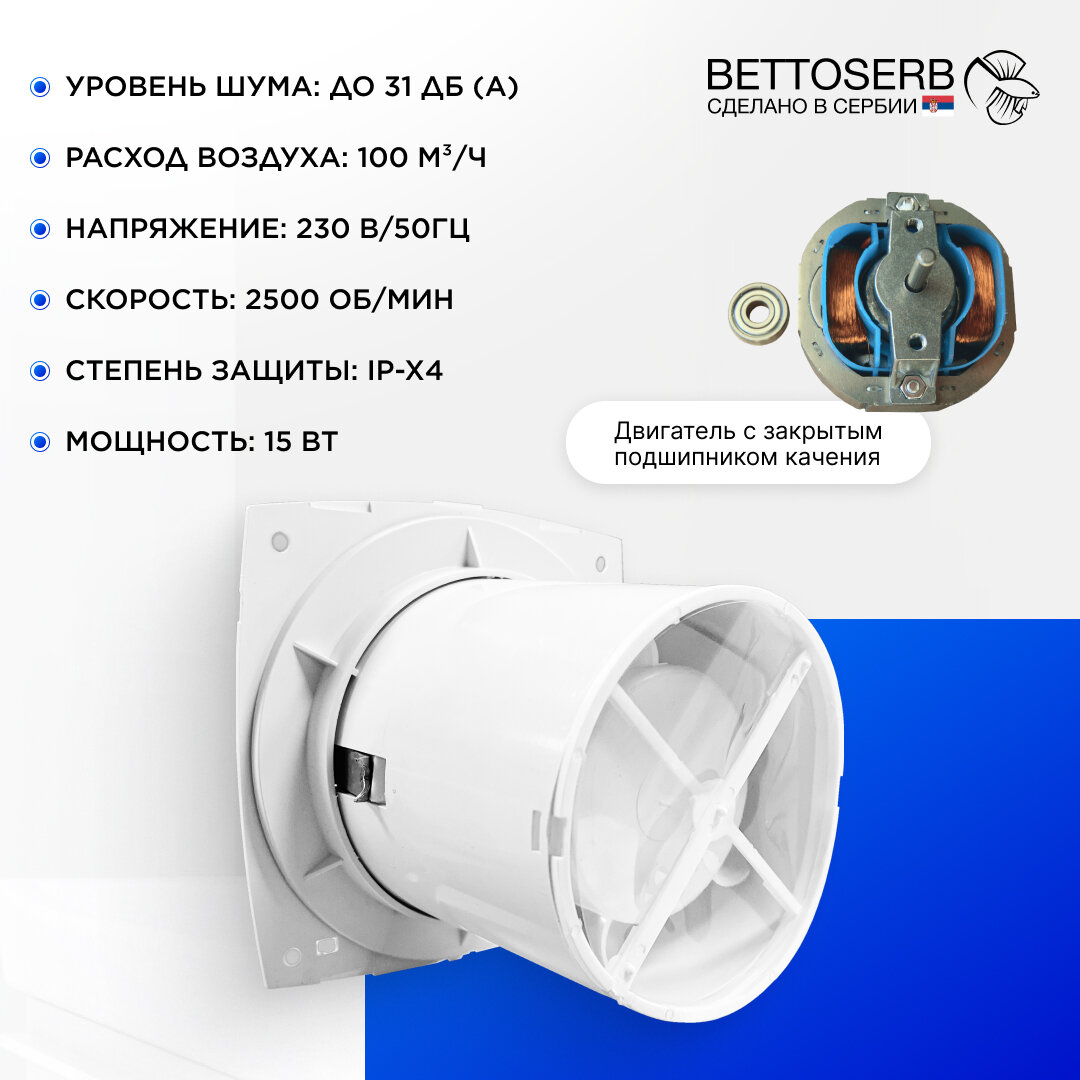 Вентилятор вытяжной бесшумный для ванной/туалета/кухни BETTOSERB с обратным клапаном, c накладкой сталь