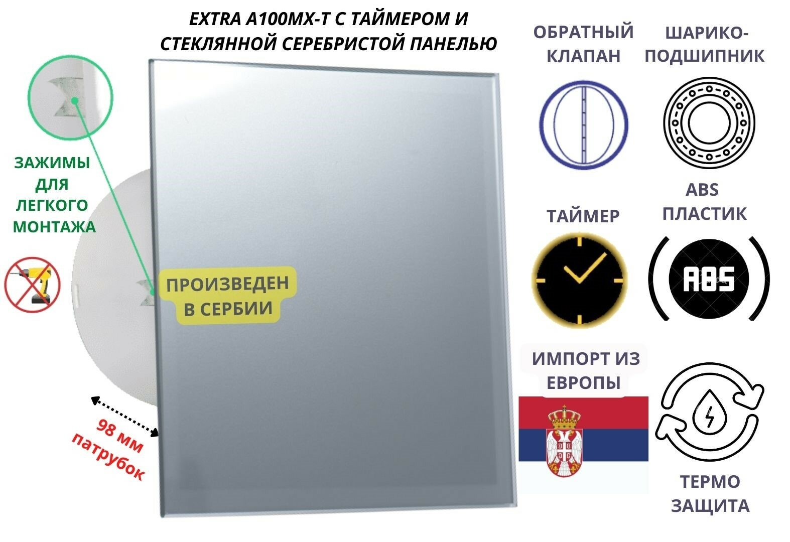 Вентилятор с таймером, со стеклянной серебристой панелью, с обратным клапаном, D100мм, установка без сверления A100МX-T, Сербия интересное:
