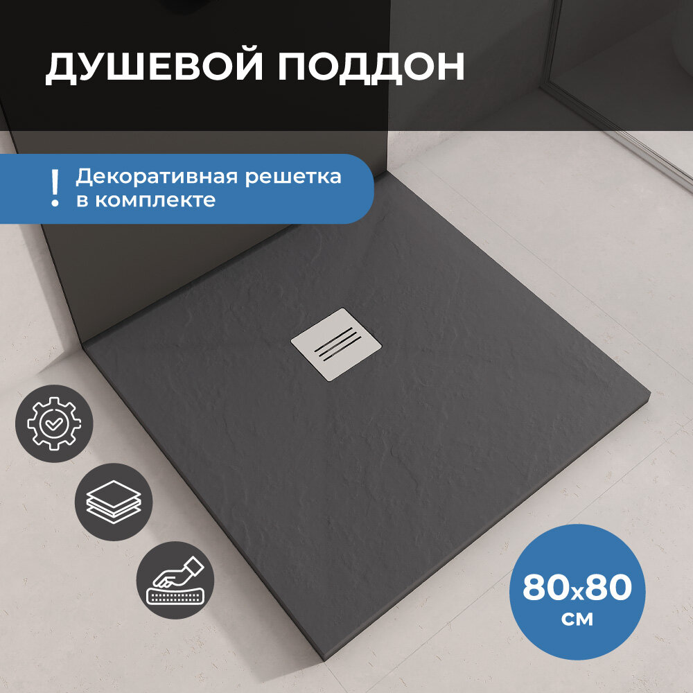 Премиальный поддон для душа INRAIN из искусственного камня квадратный 80х80х2,5см Графит с решеткой на сифон