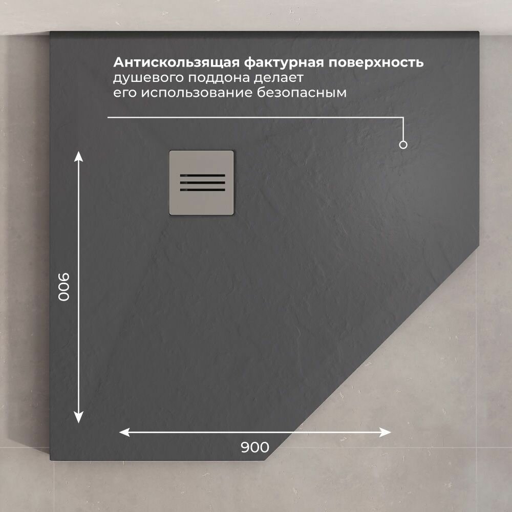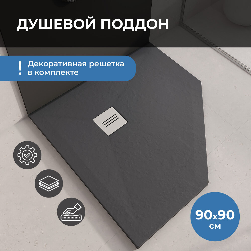 Премиальный поддон для душа INRAIN из искусственного камня трапеция Т-90х90х3см Графит с решеткой на сифон