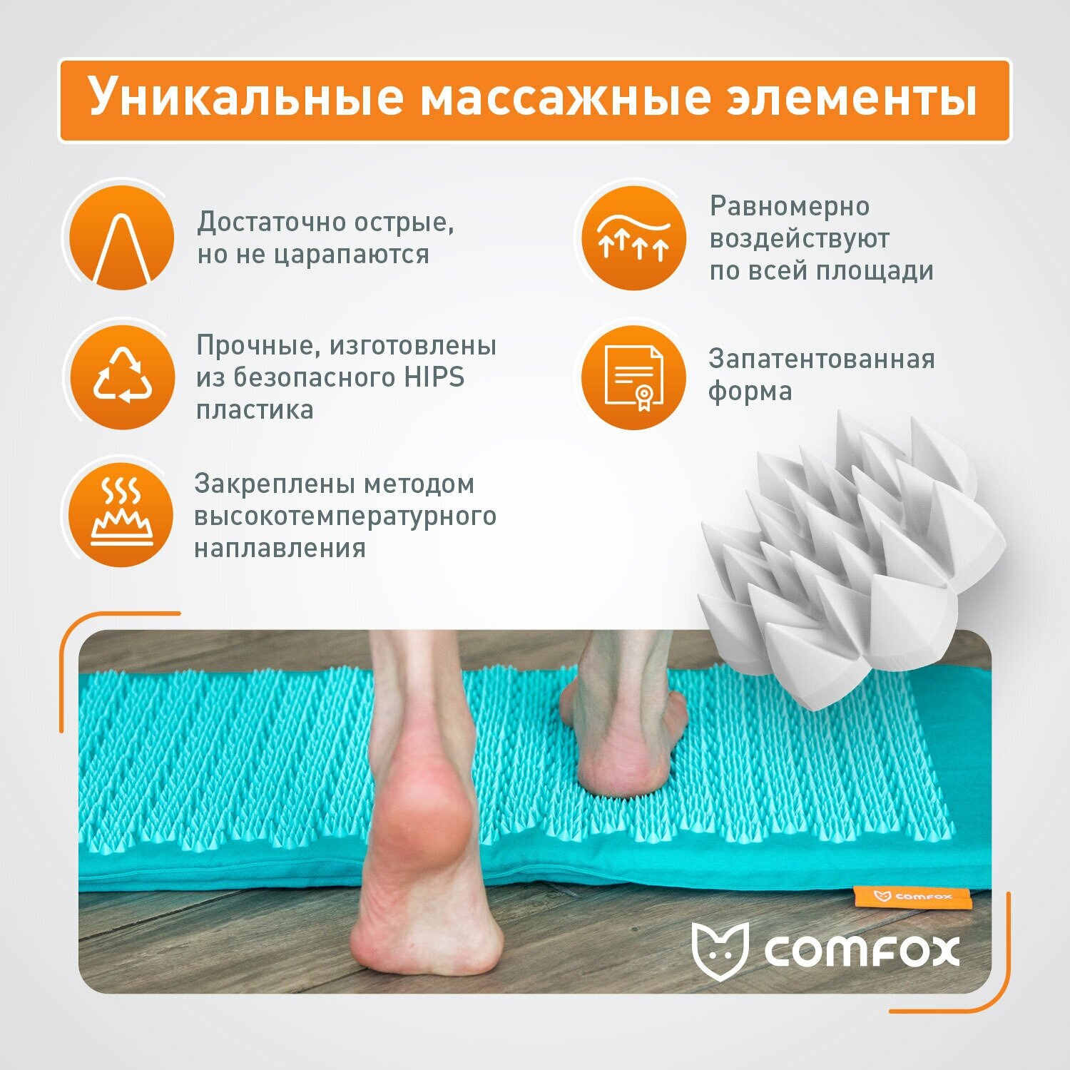 | Дополнительная информация | ехлы коврика и подушки сшиты из 100% льна, съемные, их можно стирать вручную в теплой воде ; На коврике расположены 210, а на подушке - 67 массажных цветков, каждый из которых имеет 25 колющих вершин ; равномерное точечное воздействие на всю поверхность тела ; Цветки изготовлены из HIPS пластика, не содержат фталатов, тяжелых металлов, не вызывают аллергии, не травмируют кожу и помогают получить полноценный массажный эффект ; Коврик и подушка оказывают акупрессурное воздействие на кожу, стимулируя кровоток |