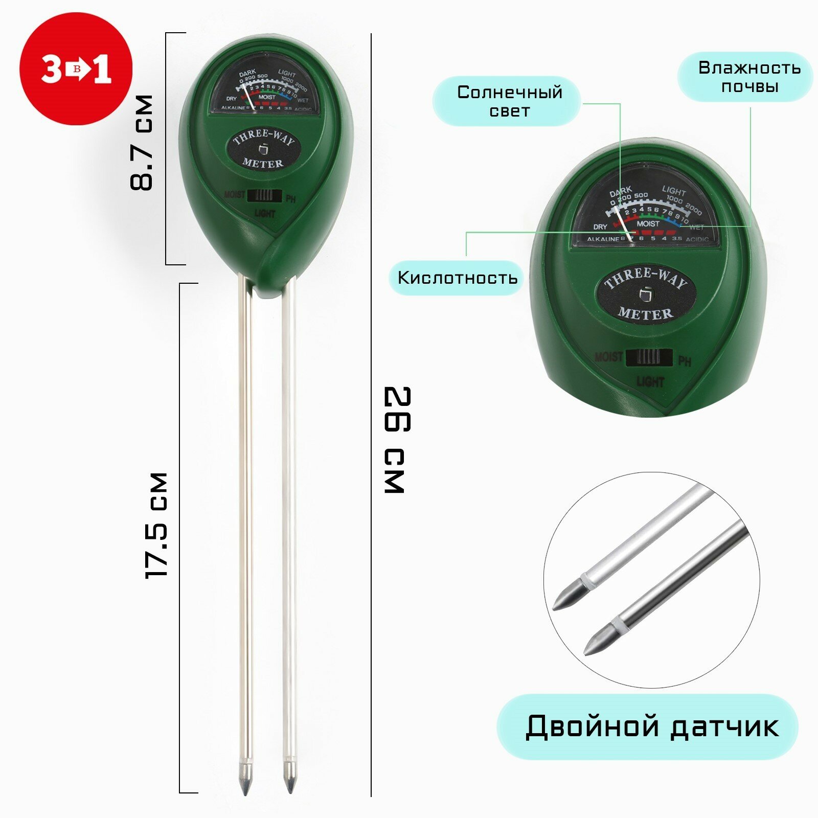 Прибор 3 в 1: pH измеритель солнечного света, кислотности почвы, влажности почвы, l-26 см интересное: