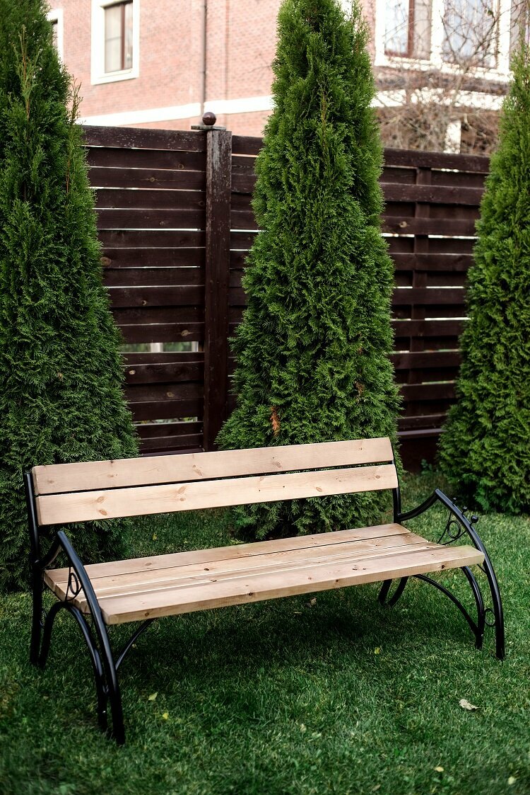 Скамейка садовая Классика с деревянными спинкой и сиденьем без покраски, лавочка для дачи с металлическим каркасом