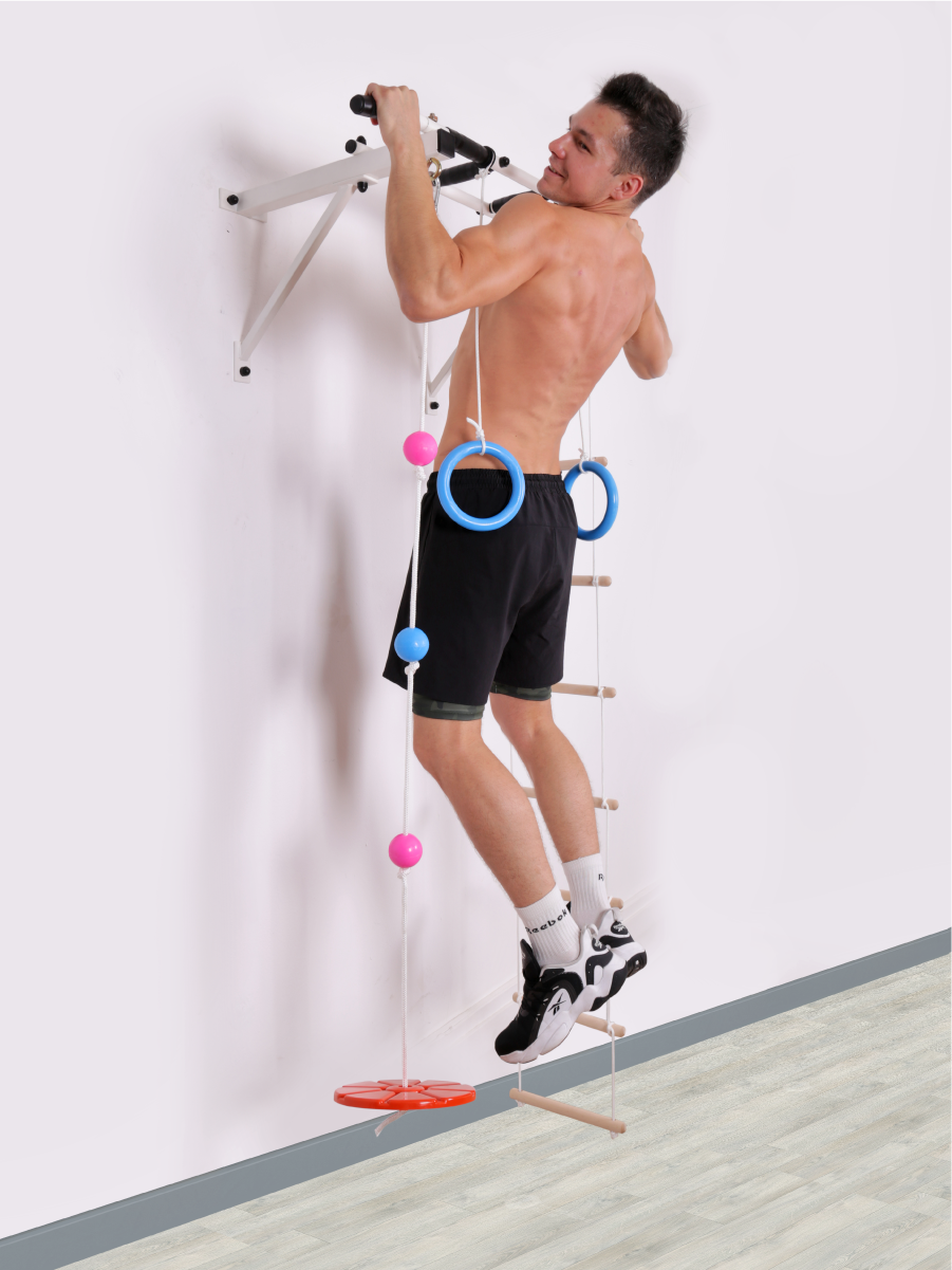Купить Турник Оптимист (тарзанка, лестница, кольца) белый с черными ручками