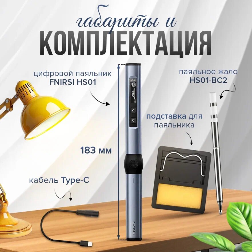| Комплектация | цифровой паяльник FNIRSI HS01, жало HS01-BC2, кабель Type-C - DC 5.5 x 2.1, подставка для паяльника, руководство пользователя |