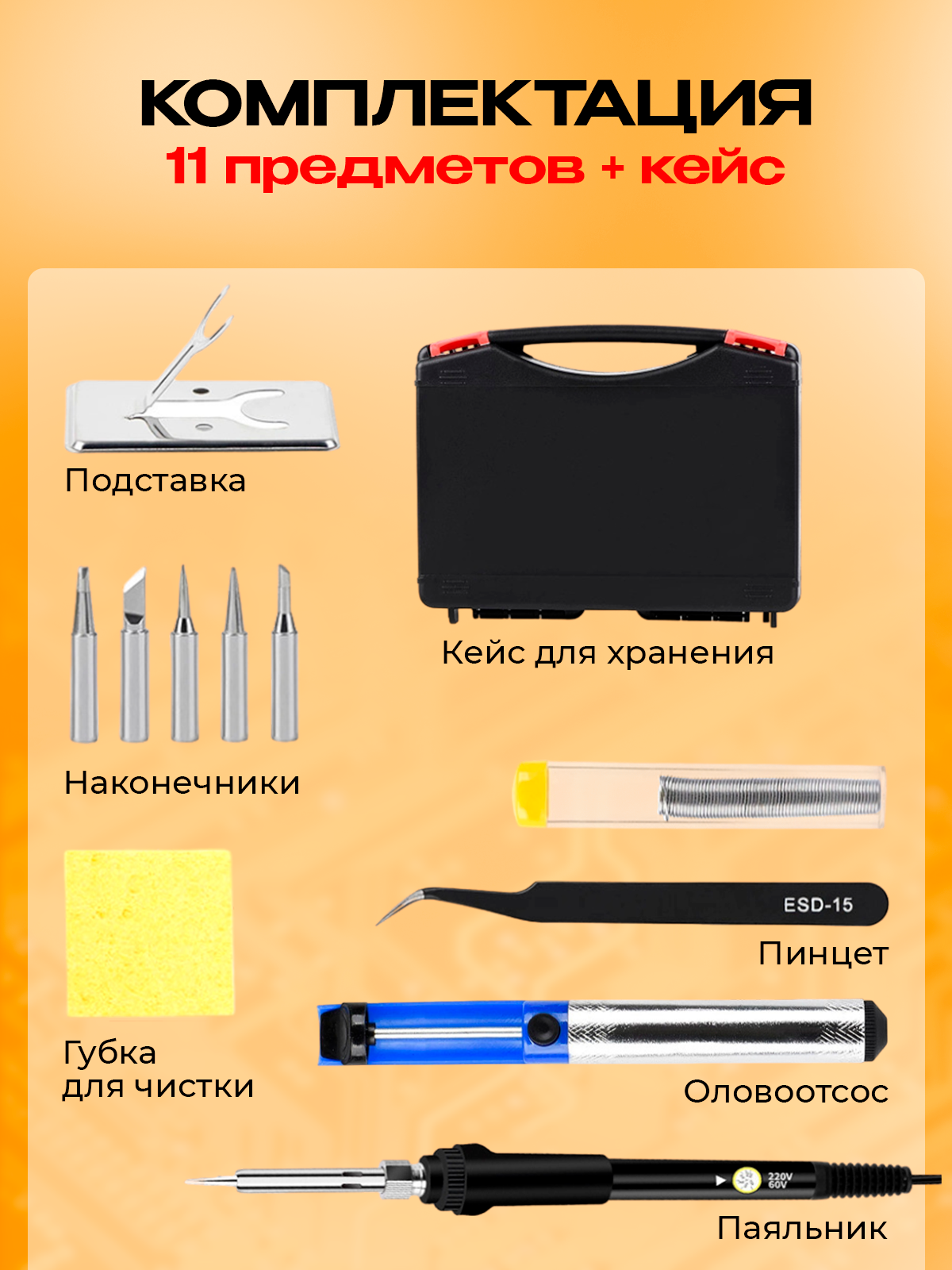 | Комплектация | припой с флюсом (канифоль), жало для паяльника (5 штук), подставка, губка для чистки, пинцет, оловоотсос плюс удобный кейс |