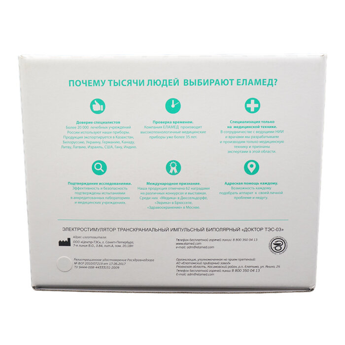 | Комплектность | Аппарат "Доктор ТЭС-03", Соединительный провод, Электроды гелевые, Налобная повязка, Батарея питания "Крона", Потребительская упаковка, Руководство пользователя, Брошюра "О методе ТЭС", CD-диск с аудио-сеансом электропсихотерапии. |