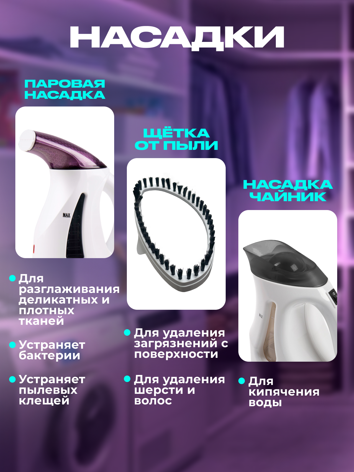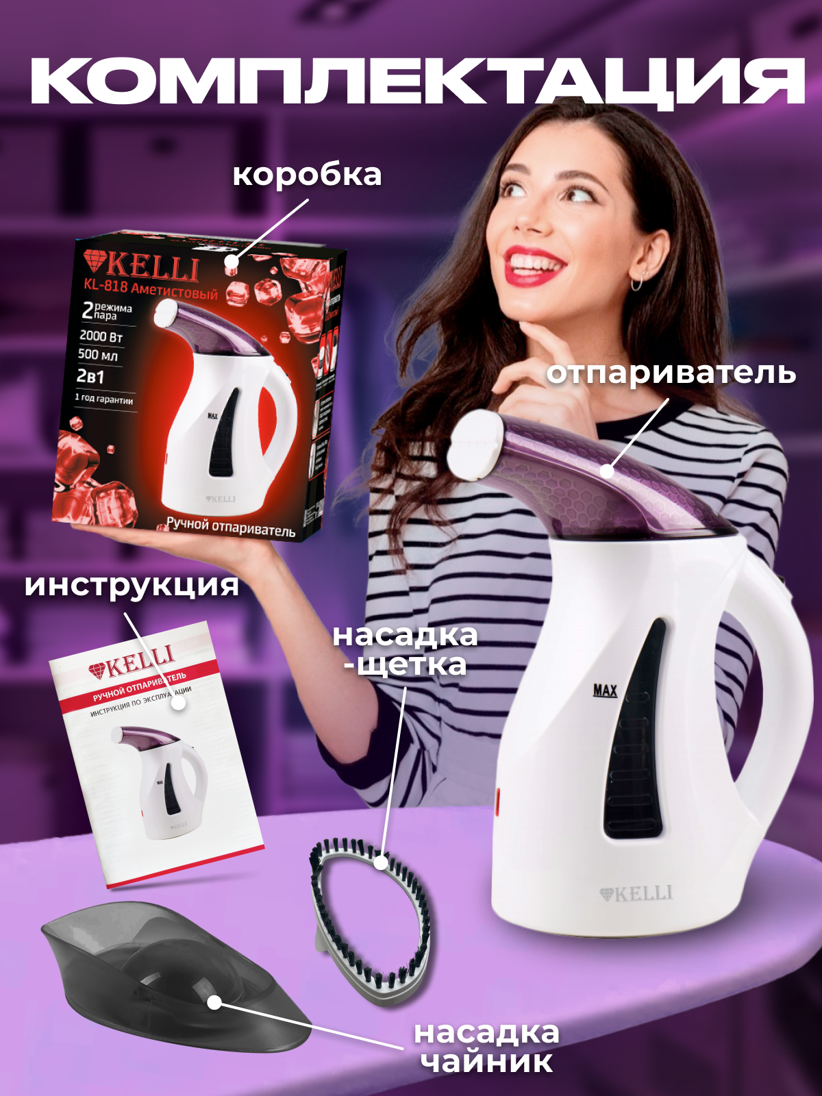 Отпариватель ручной Kelli для одежды вертикальный с чайником, 2000 Вт, аметисовый интересное: