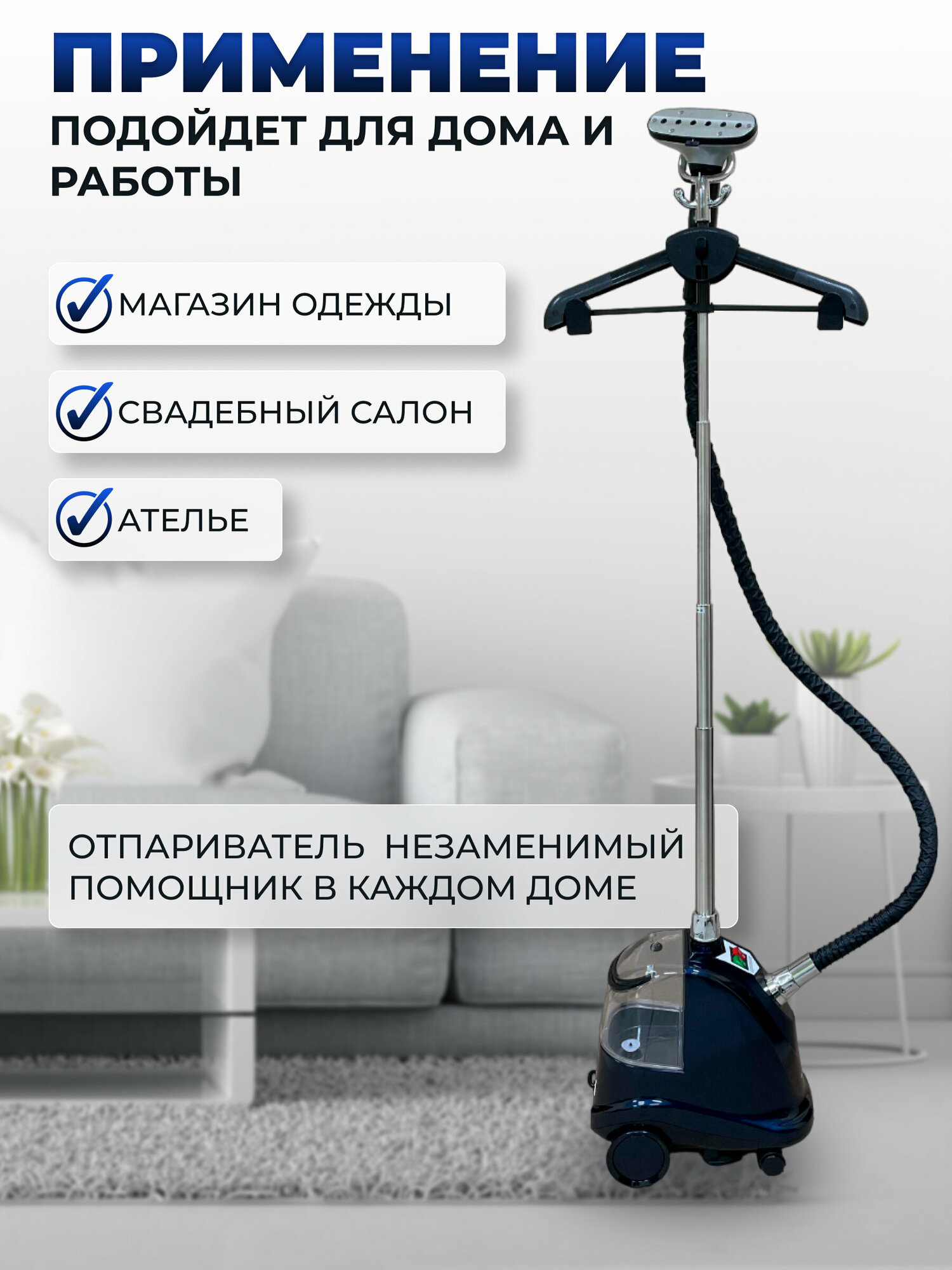 Вертикальный отпариватель - парогенератор напольный с вешалкой, для одежды, штор, тканей, покрывал, меховых изделий, синий. интересное: