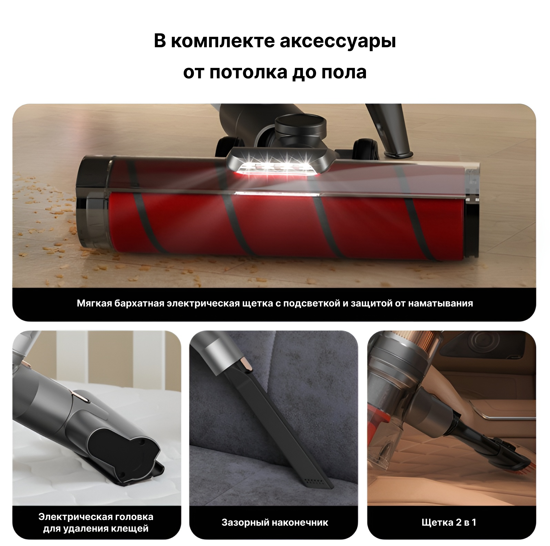 | Дополнительные функции | возможность использования в автомобиле / подсветка зоны уборки / удаление пылевого клеща |