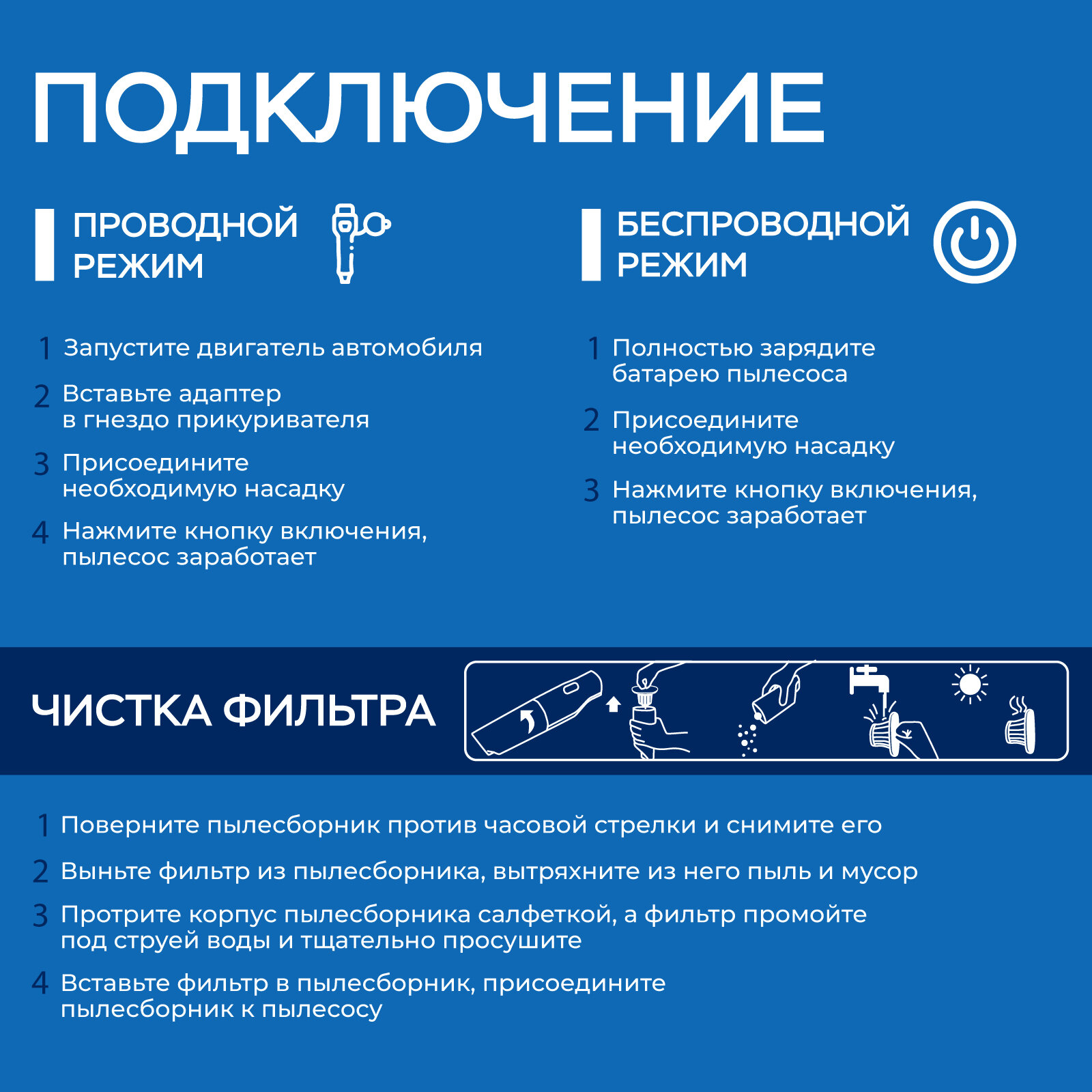 | В комплекте | зарядное устройство, насадка для автомобиля, удлинительная трубка/шланг, универсальная насадка для сухой уборки, щелевая насадка |