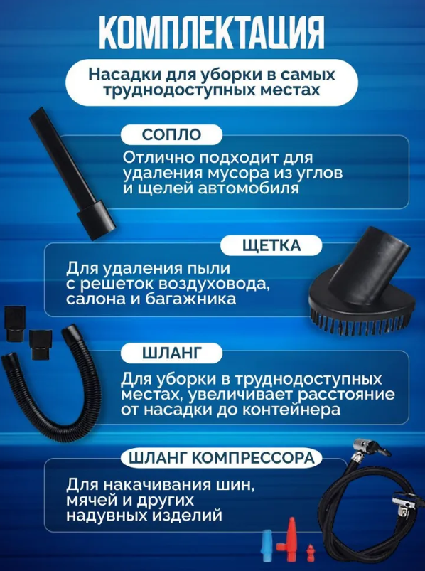 | Дополнительные функции | возможность использования в автомобиле / подсветка зоны уборки |