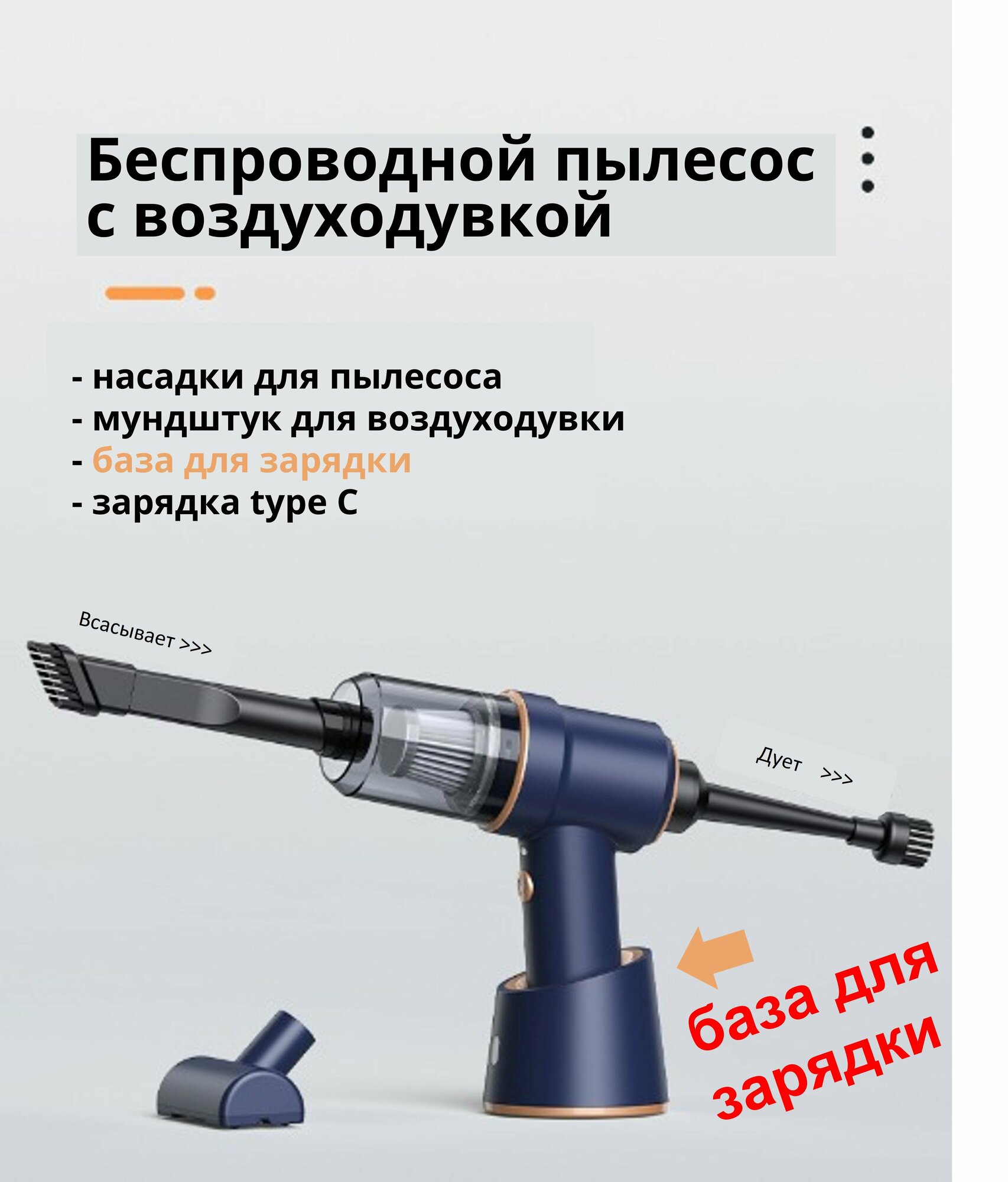 | В комплекте | зарядное устройство, насадка для автомобиля, насадка для клавиатуры, насадка для сбора жидкости |