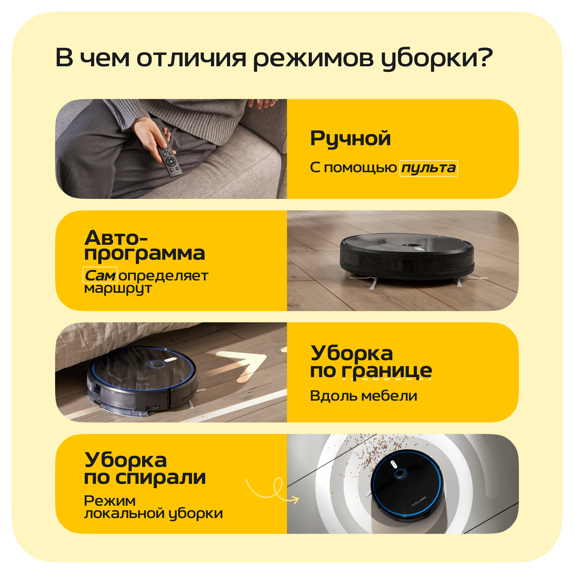 | Режимы работы | движение вдоль стен / движение по спирали / местная уборка / турборежим |