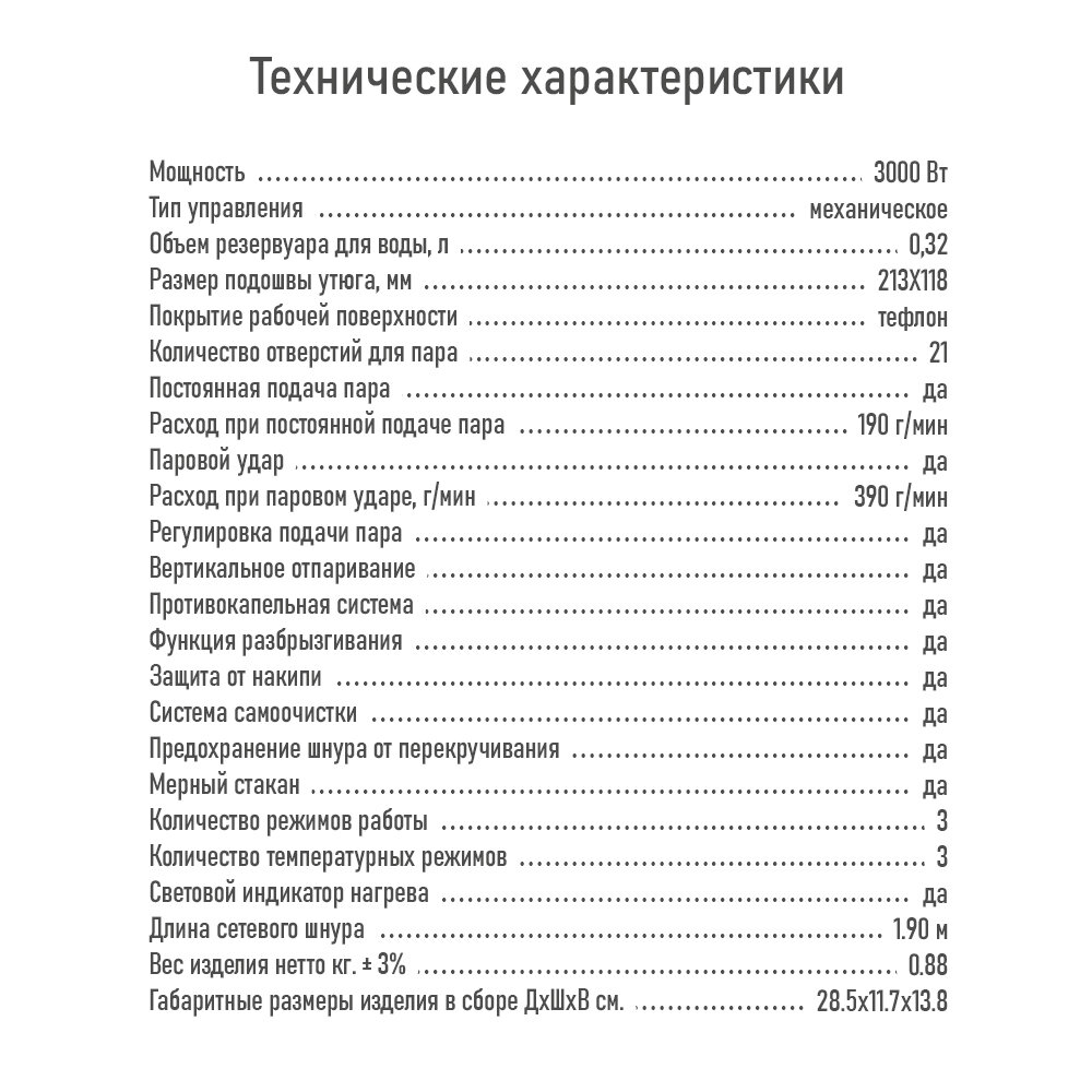 | Дополнительные функции | паровой удар / система самоочистки / сухая глажка / функция разбрызгивания |