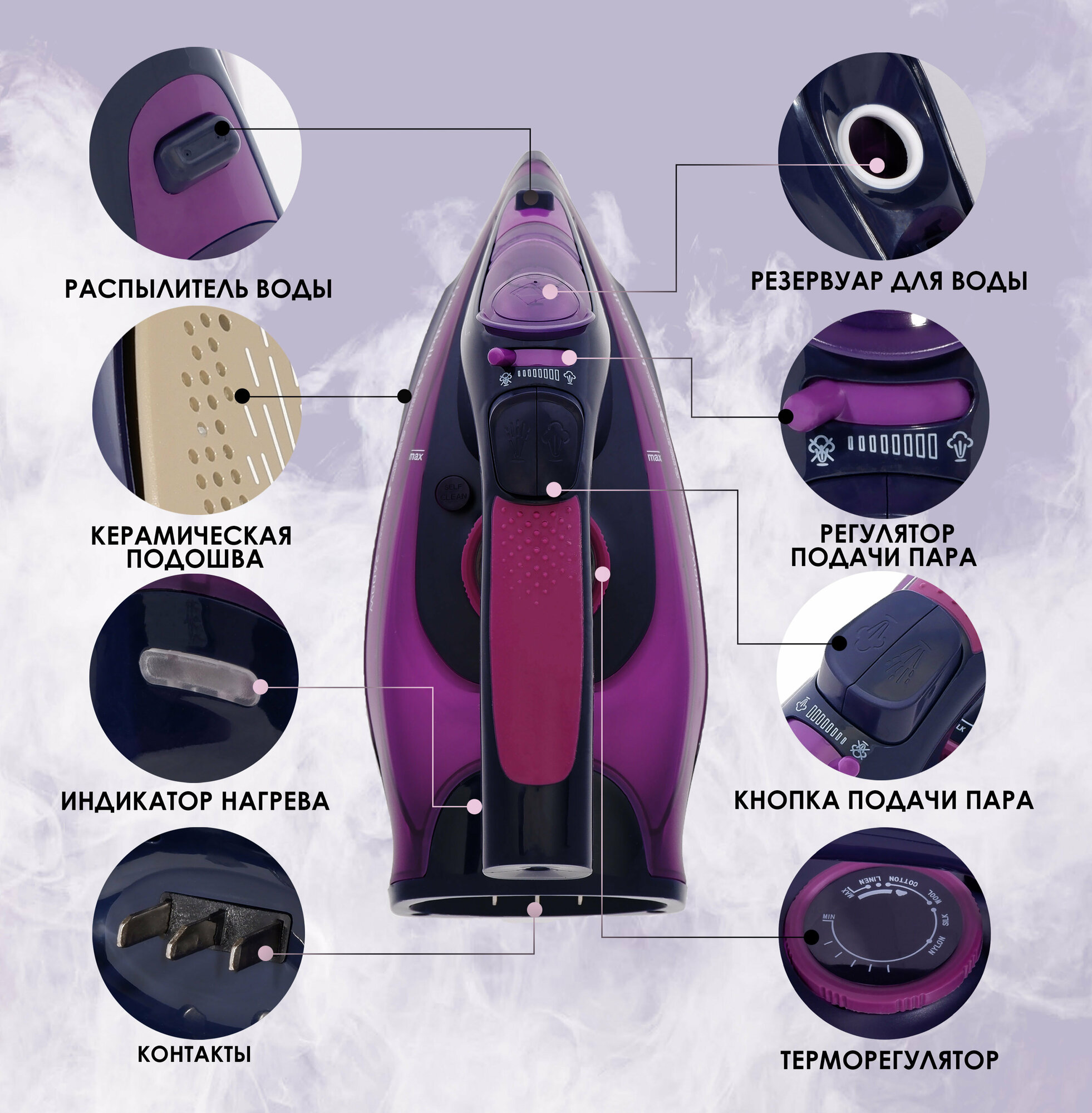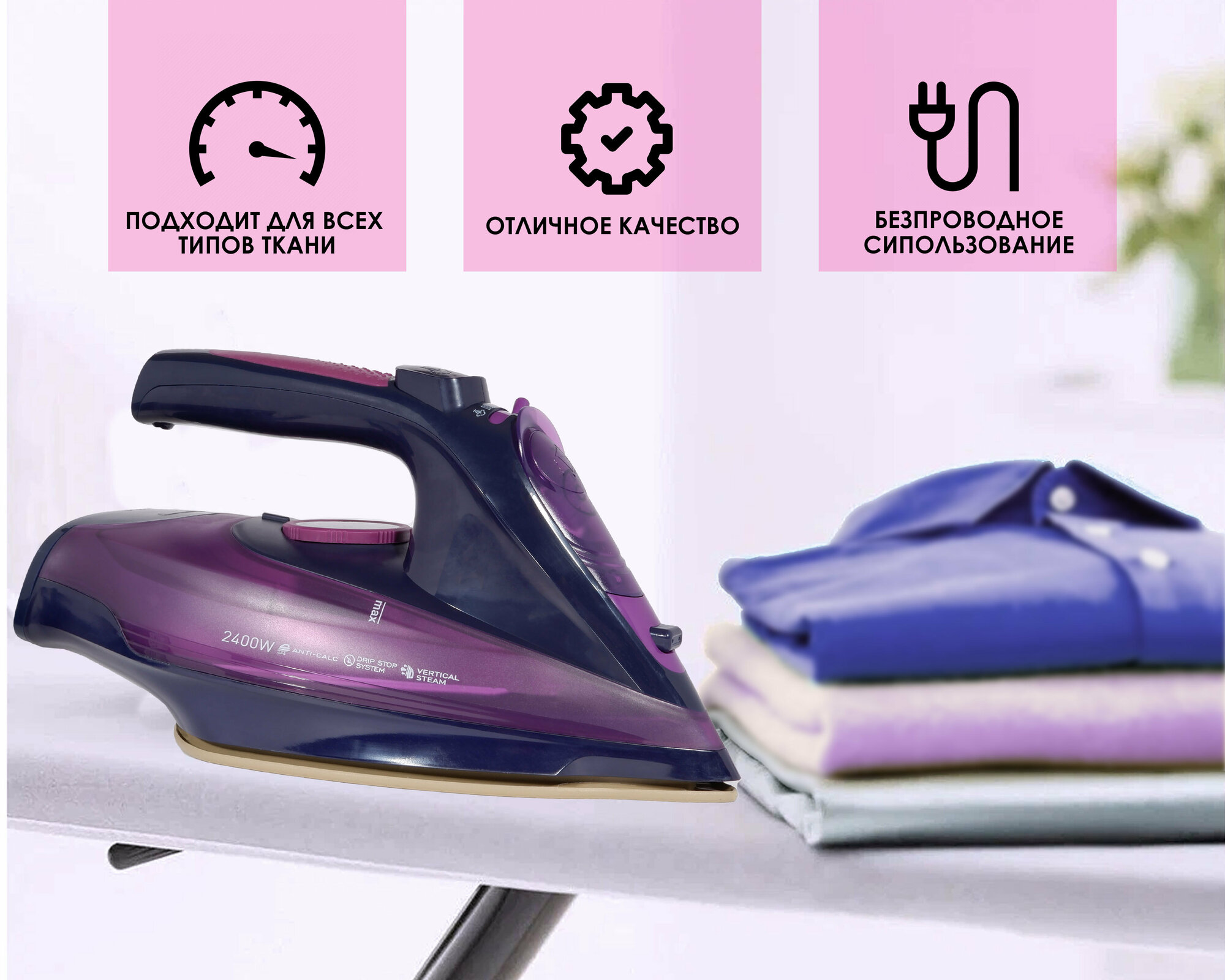 Домашний утюг беспроводной, с функцией вертикальной глажки, паровой удар, антипригарное покрытие, система самоочистки,2400Вт, фиолетовый интересное: