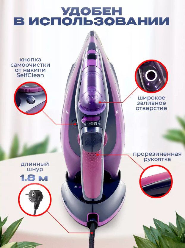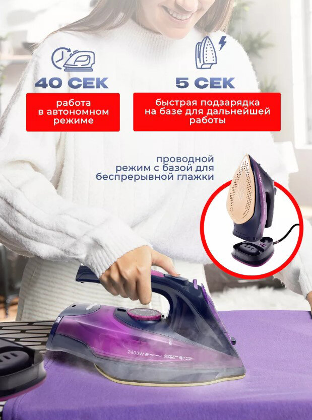 Утюг беспроводной, с функцией вертикальной глажки, паровой удар,домашний,антипригарное покрытие, система самоочистки,2400Вт, фиолетовый