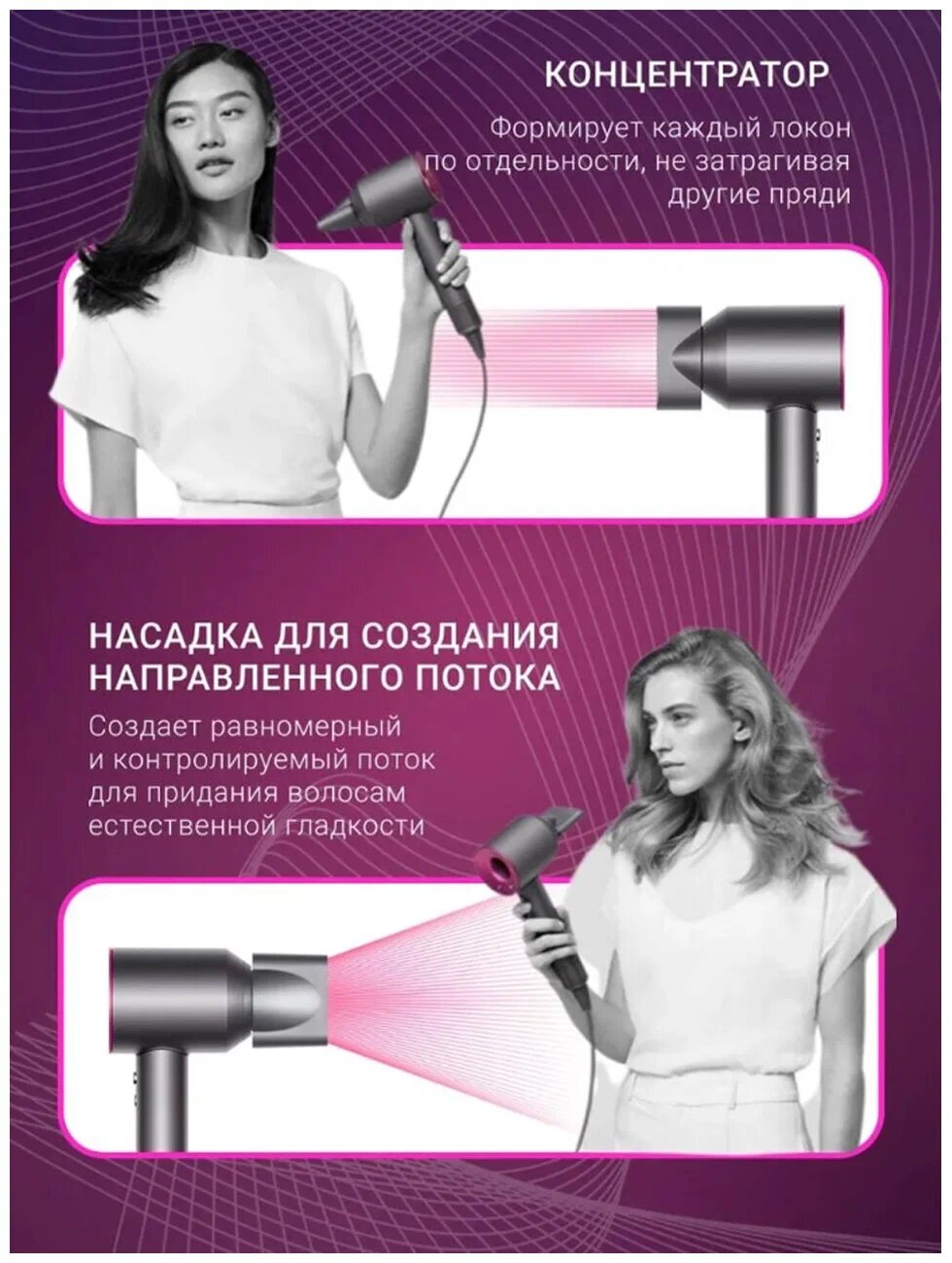 | Насадки | диффузор / для бережного высушивания / для выпрямления / для непослушных волос / концентратор / направленный поток |