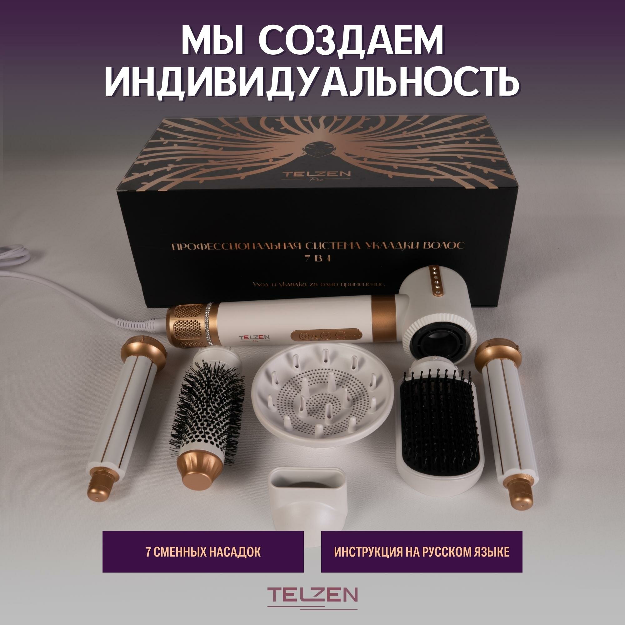 Купить Фен для волос мультистайлер 7 в 1 Telzen с насадками профессиональный, стайлер для завивки и укладки белый