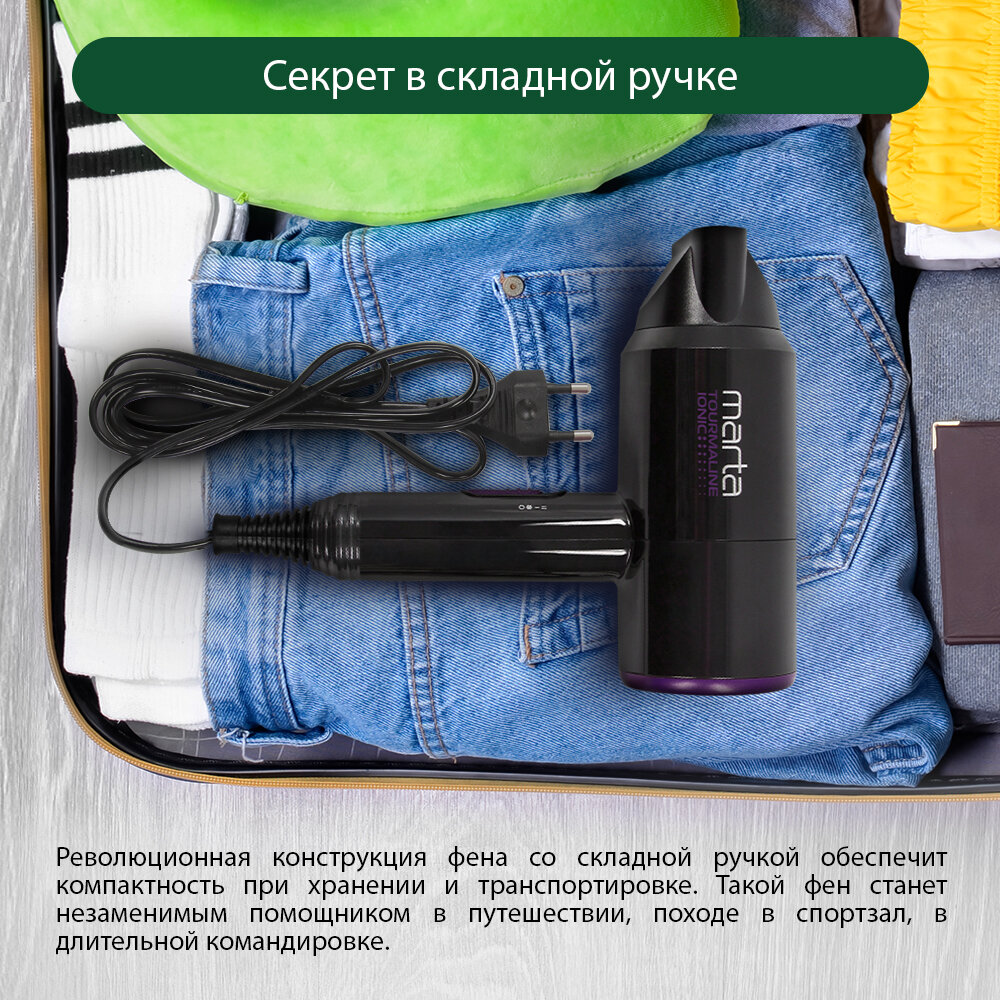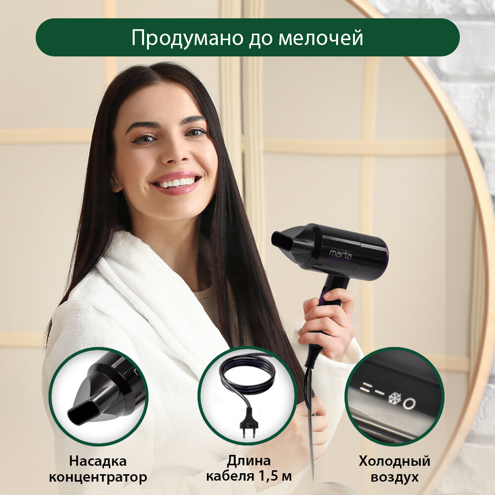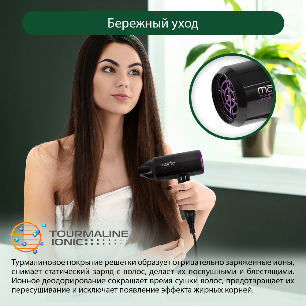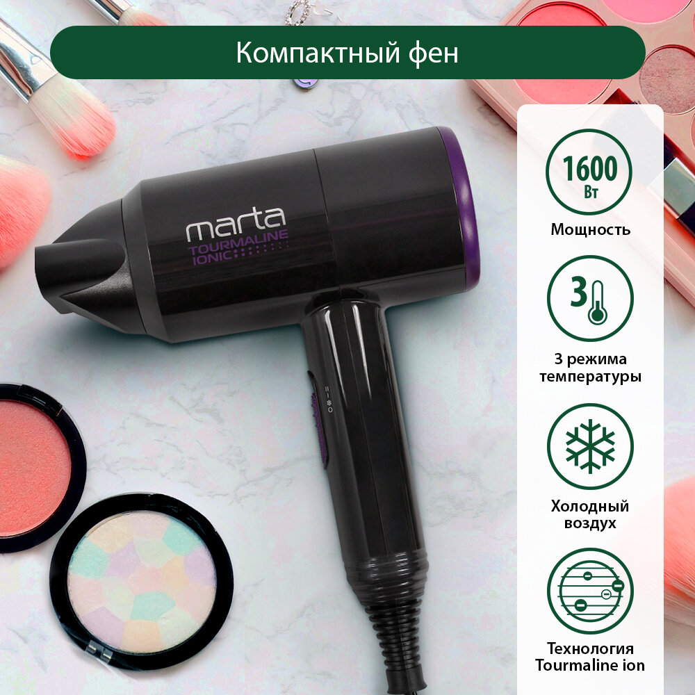 Купить Фен MARTA MT-1267 черный чароит Технология tourmaline ionic