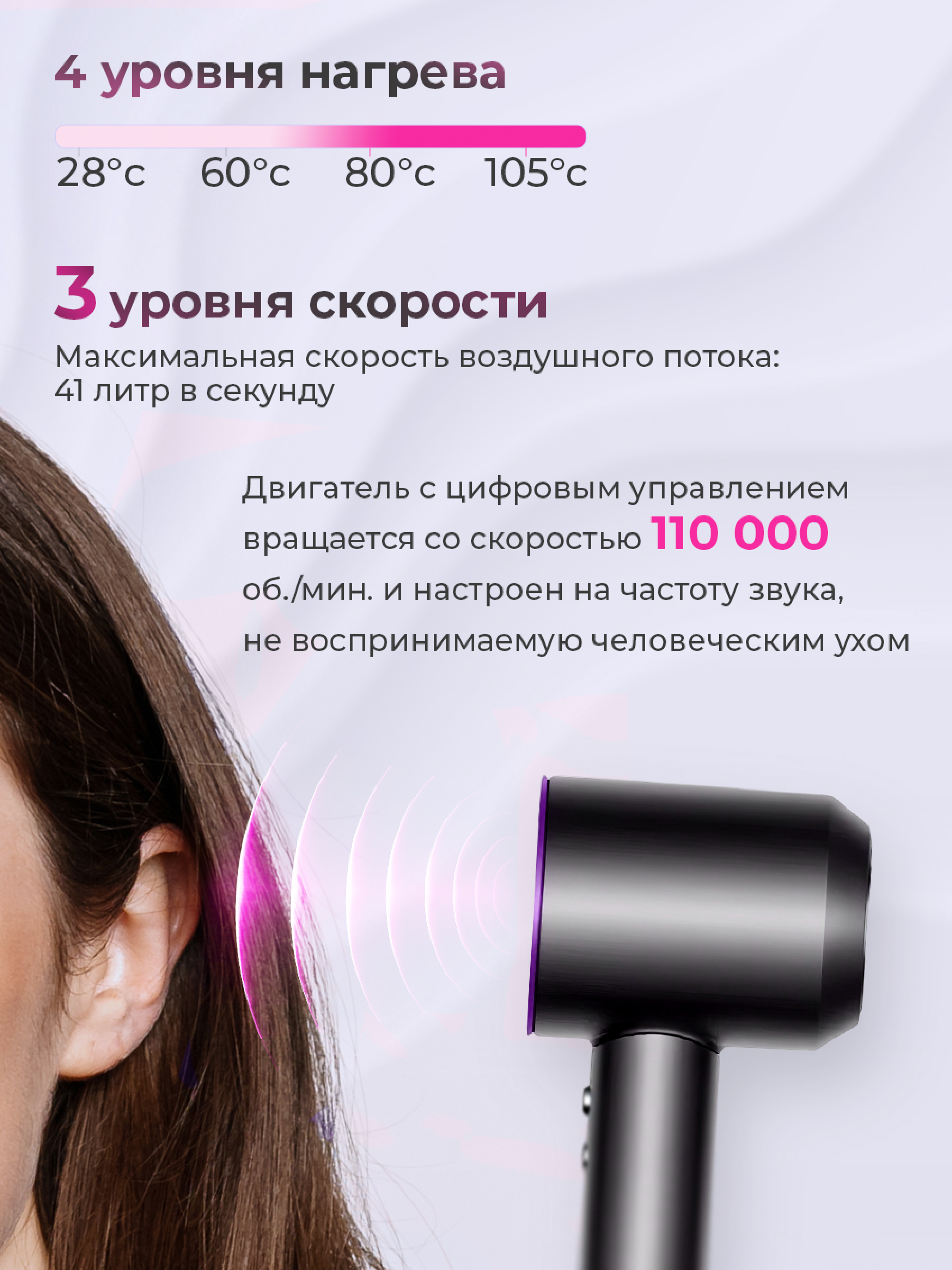 Купить Профессиональный фен для волос iHair-1600 Super Hair Dryer 1600 Вт, 3 режима, 5 магнитных насадок, ионизация воздуха, фиолетовый